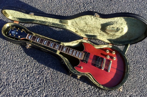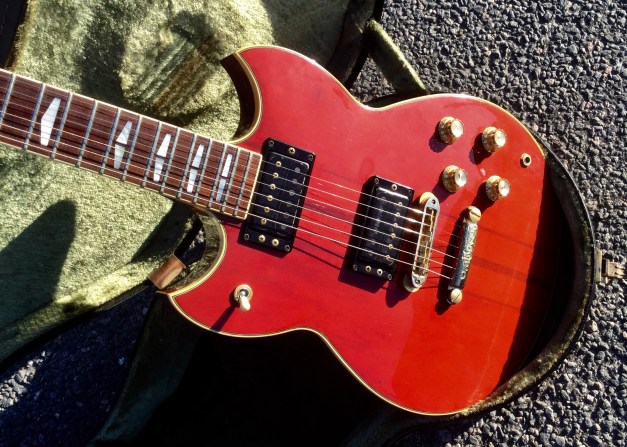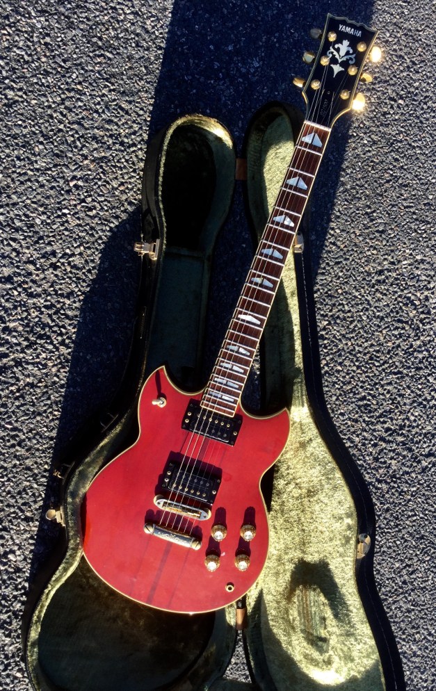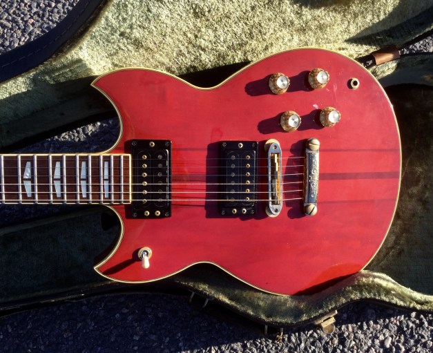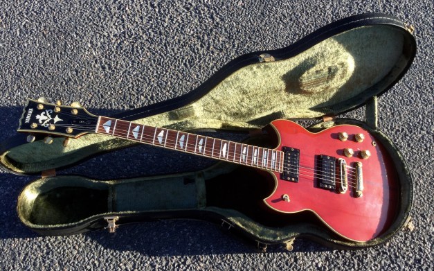 Here the Yamaha SG-1500 in translucent red. The Yamaha SG 1500 guitar is an example of a top quality build guitar. It sports a Mahogany body with thru neck, rosewood fret board, Split wing fret-board position markers. Gold plated Hardware, Twin hum-buckers, coil tapping option. The guitar is quite heavy with lots of sustain, No sustain plate fitted under bridge and no pick-guard as standard. The Yamaha SG-1500 is the in-betweenie for the renowned Yamaha SG-2000 and Yamaha SG-1000 made famous by musicians such as Carlos Santana and Bob Marley. Set up with low action and kitted out with powerful double hum buckers make for a killer guitar.