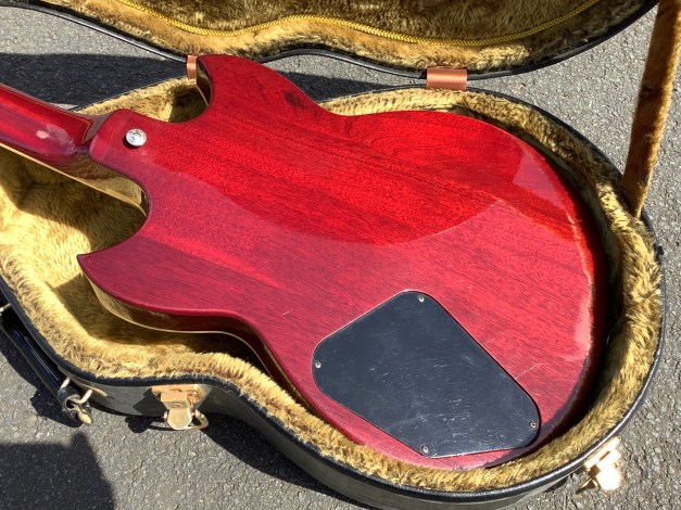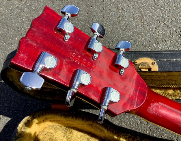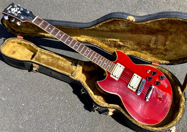 The Yamaha SG-300 like this Burgundy Red was introduced in 1982 to succeed the Yamaha SG-500 and Yamaha SG-600 that were issued in 1976-1981 as a more budget addition to the initial Yamaha SG line up. The SG-300 came in either burgundy red or black. It is a light-weight guitar and combined with its simple but effective design makes it a superb instrument and easy to play. The power comes from 2 high output double open hum-buckers possibly Ceramic. Hardware is chrome with an engraved tailpiece and simple tune-o-matic bridge and diecast tuners. The SG-300 appears to be quite uncommon and was not issued in Japan.