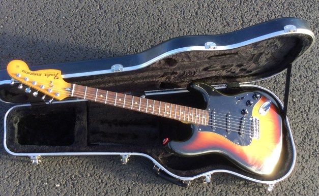Here another iconic Fender USA guitar in the collection, a faded/aged Three-tone Tobacco burst Fender Stratocaster electric guitar. Great 1977 vintage guitar and a classy looker too. All electrics work well. Here we have an SRV Model with genuine play wear and patina without all the modern day relicing. You won’t find many like this in such a great nick. Great looker and a killer player, as you would expect from a classic guitar. The finish has beautifully aged to a and the neck has a lovely satin finish, the paint of the neck has aged and worn off in some of the played areas making it a fast player too. So here we have a very collectible rock machine with ounces of mojo and a great vintage feel to it. Lives in a 1980s fender case.