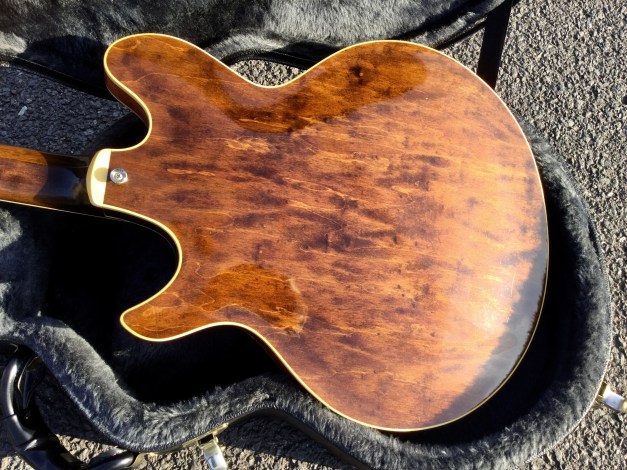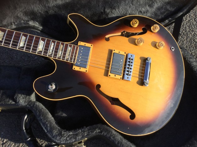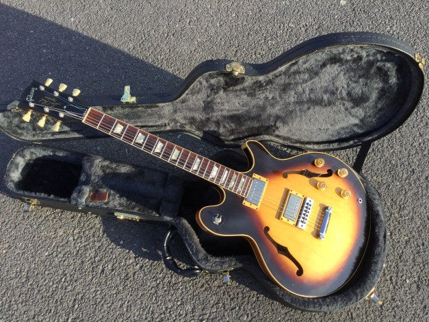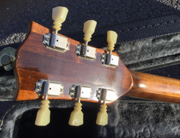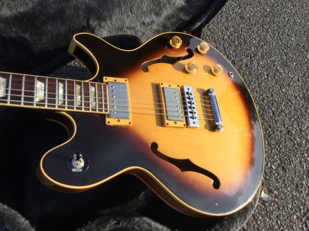 Here a rare guitar, a Gibson Les Paul Signature in Tobacco Sunburst prototype? This model was designed by Les Paul himself and only put forward for production in the early 1970s. Prototypes started in 1972 and full production not until 1973 and finished in the late 1970s. Researching the various sources and literature shows these were made in 3 finishes, Most common the Goldtop, then the Cherry Sunburst, and rarest the Tobacco Sunburst version. Apparently the 1972/3 issue was 3 in Tobacco Sunburst. The original low impedance Pickups were considered ineffective, and hence replaced with PAFs in order to get the more rocky and responsive ES-335 sound.