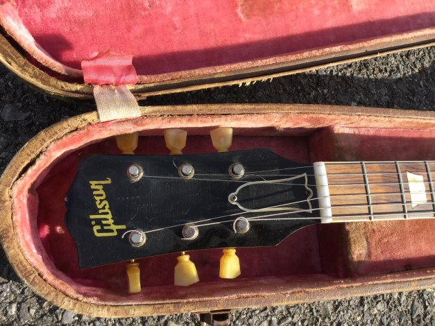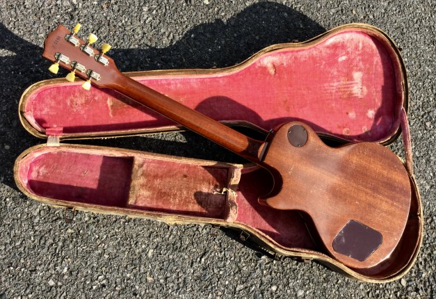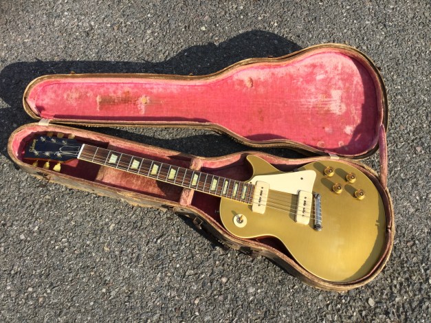 The Gibson Les Paul Standard stands as one of the most widely played and recognisable guitars ever. First marketed as the Les Paul model in 1952, the Les Paul evolved in the ’50s until the design was replaced by the SG in late 1960/1. Up until 1958, the Les Paul models sported a gold metallic finish, and guitars from this era are collectively referred to as Goldtops. Goldtop Les Pauls are becoming sought after and prized by collectors, and each production year showcases the innovations made by Gibson throughout the decade. This model is quite basic, and has the wraparound stud tail piece that proved more sturdy than the trapeze tailpiece that came with the early 1952 models. This wrap job is called a combination stud bridge/tailpiece, and was commonly used by end of 1953. Not long after this, the separate bridge/tailpiece was introduced that overtook the use of the wraparound. The LPs with a trapeze tailpiece are considered less desirable to collectors. The guitar sports a Single cutaway solid-body, Mahogany, Maple top, Mahogany neck, Rosewood fingerboard. Two single-coil P90 pickups, trapezoid inlays, Kluson tuners, four control knobs, three-way pickup selector, white pickguard, bound fingerboard, stud bridge/tailpiece.