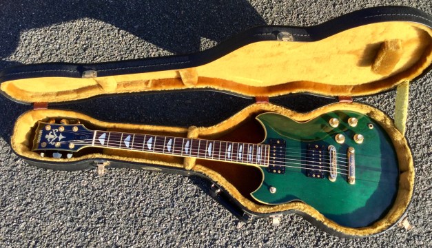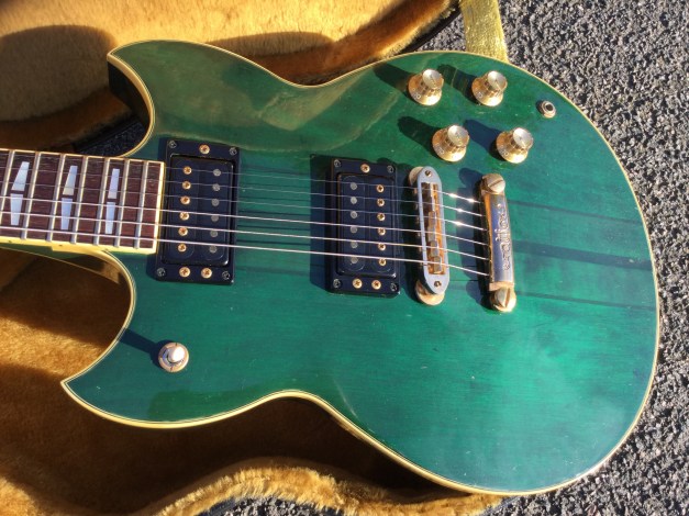 The Yamaha SG-1500 guitar is an example of a top quality build guitar. It sports a mahogany body with thru neck, rosewood fret board, Split wing fret-board position markers. Gold plated Hardware, Twin hum-buckers, coil tapping option. The guitar is quite heavy with lots of sustain, No sustain plate fitted under bridge and no pick-guard as standard. The Yamaha SG-1500 is the in-betweenie for the renowned Yamaha SG-2000 and Yamaha SG-1000. Well set up with low action and powerful double humbuckers make for a killer guitar