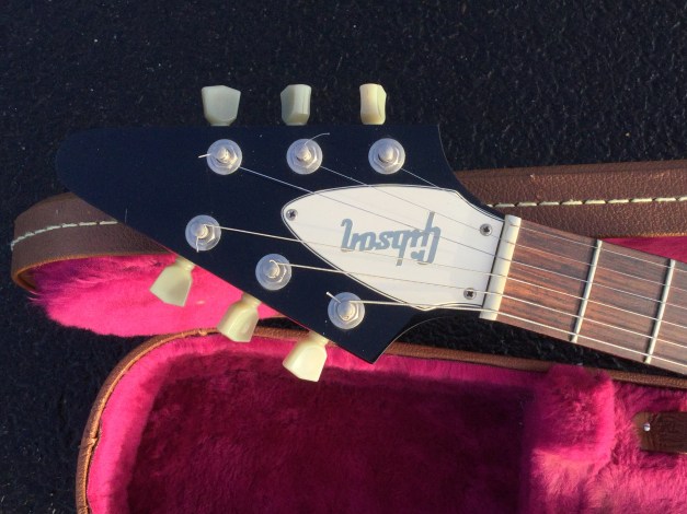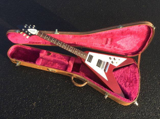 Here a great looking Gibson Flying V from 2001 (Ser 01151489). It’s a 2001 ’67 reissue model, from what is regarded as a good wood era at Gibson. The body is made with mahogany, a mahogany neck and a rose fingerboard. The guitar is in very good overall condition with some lacquer checking over the whole guitar and the onset of yellowing of the binding. This beast has killer looks and is very playable, with it being It’s lightweight and at the same time highly resonant both unplugged and plugged in. The 2 The humbucker pickups are 496R and 500T models, giving a high-output that is perfect for rock, metal, and many other genres with deep and bright sounds alike. The controls layout is simple but effective, with a three-way toggle switch, a master volume, and a master tone knob. Guitar lives in its Gibson hard-case