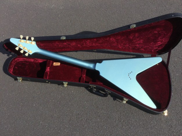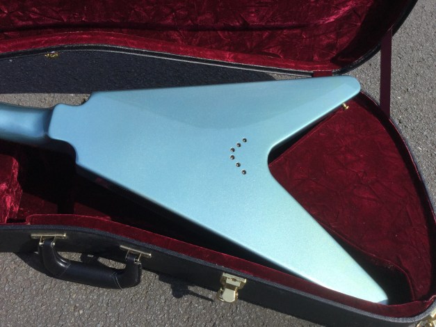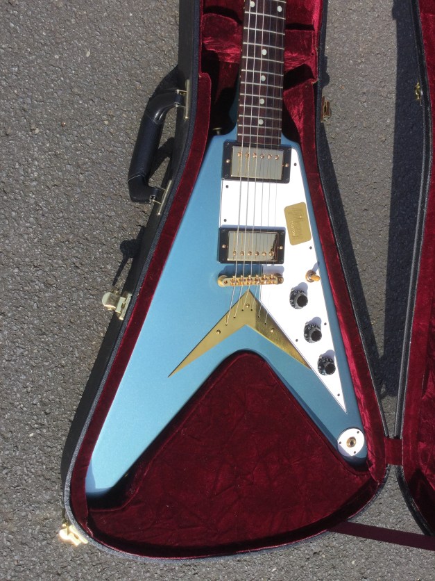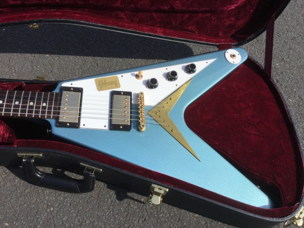 Been resisting getting a modern Gibbo V for a long time. Well here it is, as rare limited edition, Benchmark 59 Custom Shop, Gibson Flying V. Spotted this Custom V and had to get it, turns out a hell of a great sound over a VOX AC30, clean etc, and also quite crunchy when put in slight overdrive. Despite the quite flat wide neck, the guitar plays superb and I consider it a great V. The strings are placed in a body thru fashion giving it more sustain. Guitar lives in its custom case, built like a boat.