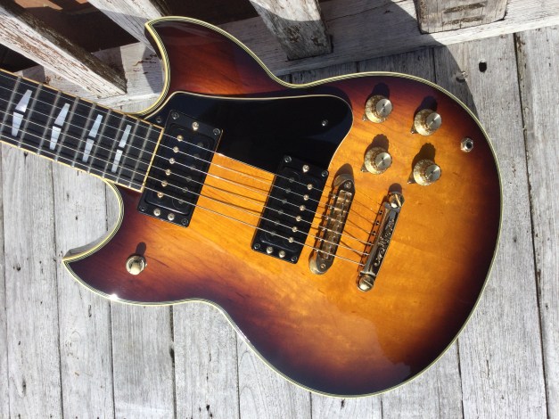 Here a 1980 Yamaha SG-1000 in Tobacco Sunburst finish, Generally we still see quite a few SG-guitars kicking about, but the SG-1000/2000 are becoming harder to get. The brass plated hardware shows some minor signs of use. The SG-1000 has been a great guitar and the weapon of choice of many renowned players.