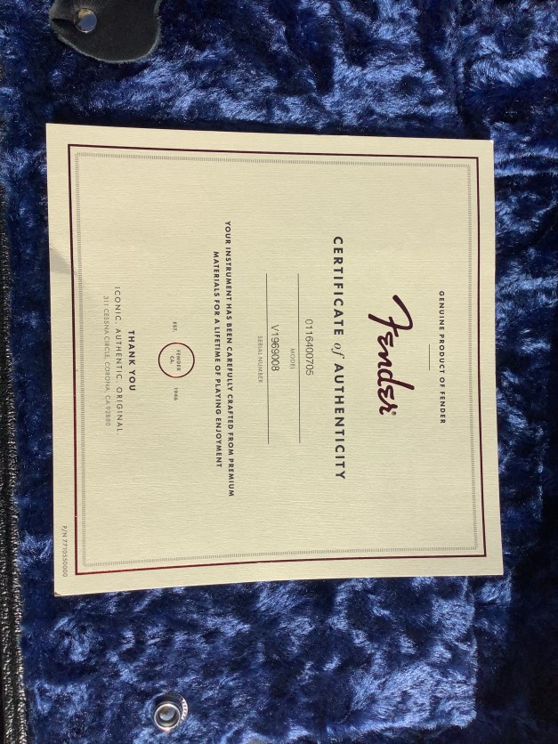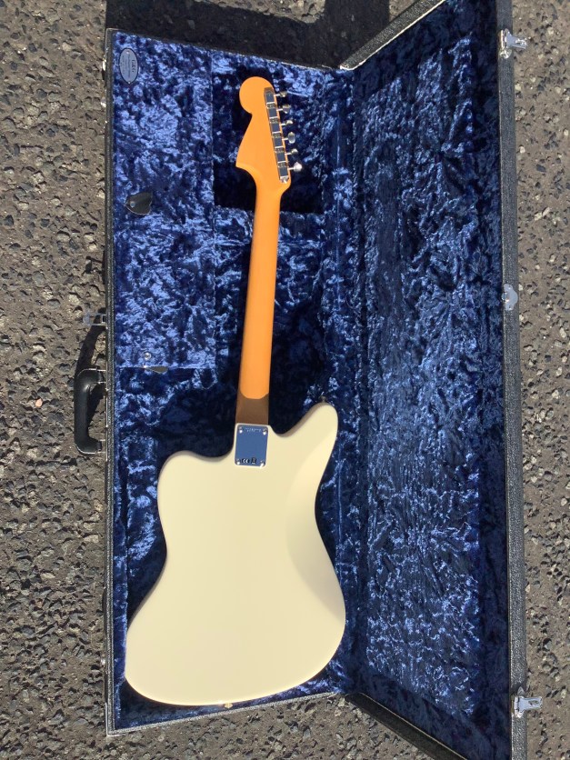 Here a Jaguar based on Johnny Marr’s 1965 Jaguar model with some special features such as the 2 bare knuckle pickups. The Johnny Marr’s signature Jaguar also, has in stead of a slider switch, a special four-way blade pickup switch on the lower horn, and controls the bridge pickup alone, the bridge and neck pickups in parallel, the neck pickup alone, and the neck and bridge pickups. More electric wizardry, in the upper horn of the Johnny Marr Jaguar features two slide switches—a “universal” bright switch that kicks everything up a notch or two, and a separate bright switch that only affects the “series” pickup switch position. All in all a great guitar, very playable and cool to look at too.