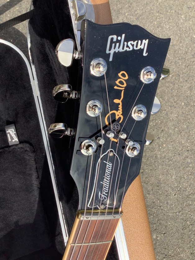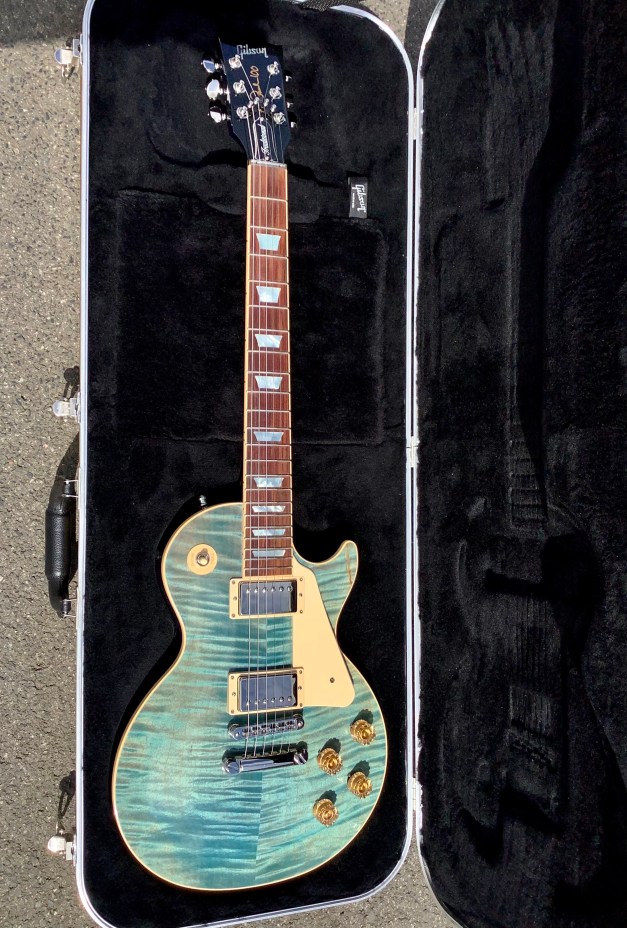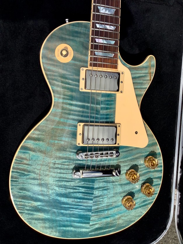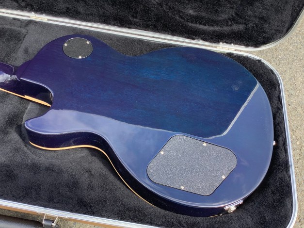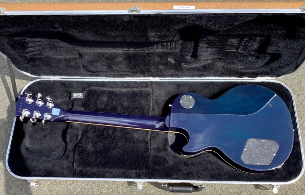 Here another guitar from the Gibson stable, an Ocean Burst Gibson Les Paul Traditional model, Made in 2015 as part of the 100-year Gibson issues. Great guitar with a fine top on it. This guitar was made in USA in 2015, and came originally with G-force robot tuners which have since been replaced by Jimmy Egypt and who also added the string Butler to guide the strings over the zero-fret. This guitar has seen little or no use use and has only polishing marks to body and is in great overall condition. A small mark is found on the on the back of the body where a drop od solder must have landed. The overall playability is superb and the guitar has a nice feel about it, aided by the fact that it has a chambered body and an asymmetrical C-shaped 50s neck. Set up nice and low, it plays like butter. The guitar lives in its aluminium rectangular hard case.