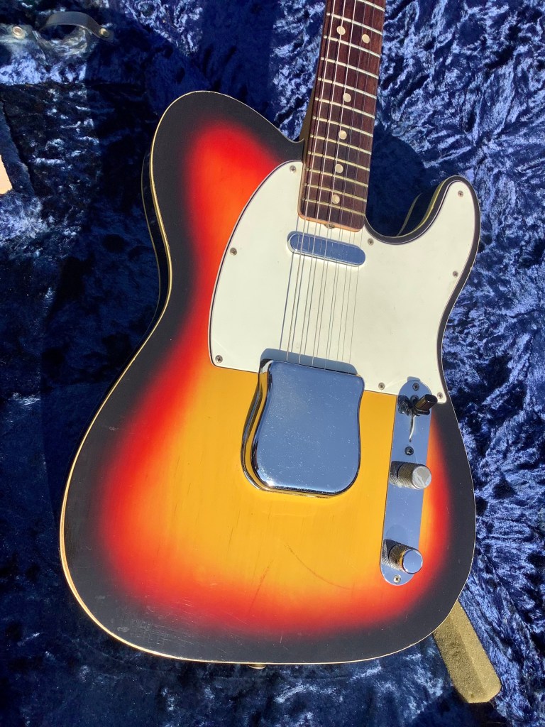Here a an uncommon Fender Telecaster Custom in Three-tone Sunburst made in USA 1966. Great vintage with all the trimmings and including a factory Fender ashtray still on it. The guitar is in great condition. Great looker with double binding on the front and back of the body topped off with a maple neck with a rose fingerboard. The guitar sounds great and although it’s the CBS year it is well put together and a good player, as you would expect from a classic Telecaster. Collectible machine to the max and great player alike You can find Tele’s in many colours, however, the three tone sunburst seems to be a hard to find specimen. As said the guitar is in great nick and the finish has developed some checking, whereas there are some but minor wear marks on the pick-guard from actual playing. Guitar lives in a period correct case.