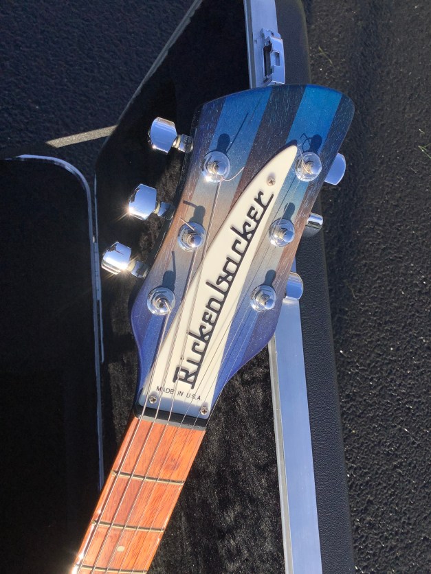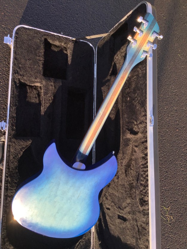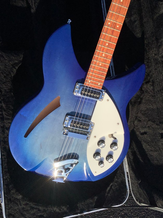 Here a Rickenbacker 330 in Blue Burst, made in USA in 2007 and is a stunning guitar. The 330 design appeared in the 1960s and has been updated over time to incorporate modern upgrades like Schaller tuners and Hi-gain pickups. The guitar has a classic sound and has the now well recognisable Rickenbacker look. The sound is quite twangy and made a a house hold tone by bands like the Jam in the 1980s. The neck has an easy accessible 24 3/4″ Scale Length, a bit shorter than the average Fender Strat, but bang on the Gibson LP range. The guitar body and neck are typically made of maple and the fingerboard is lacquered rose wood. Tuners are Schaller chrome type tuners. Guitar lives in its hard case