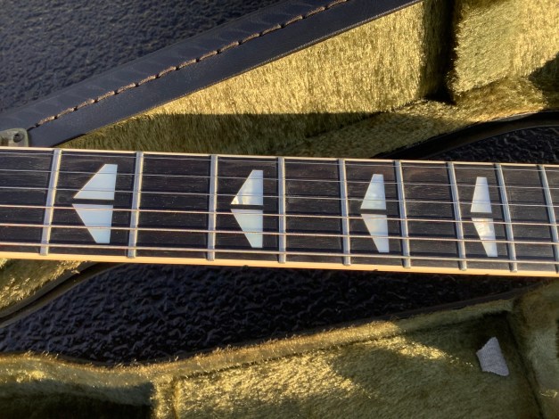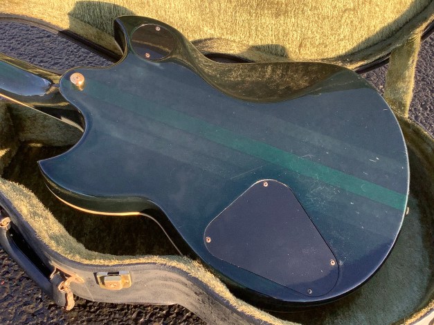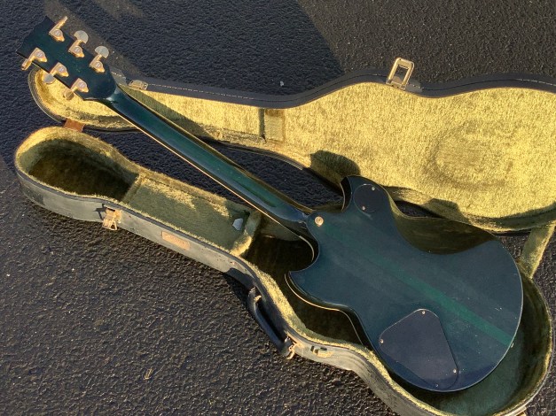 The guitar is heavy, with a genuine thru body neck that shows up beautifully in the dark brown, brass sustain plate under the bridge and an ebony fret-board with abalone split wing fret markers. The guitar came with original case. Weight of guitar approx. 4.3 kgs.