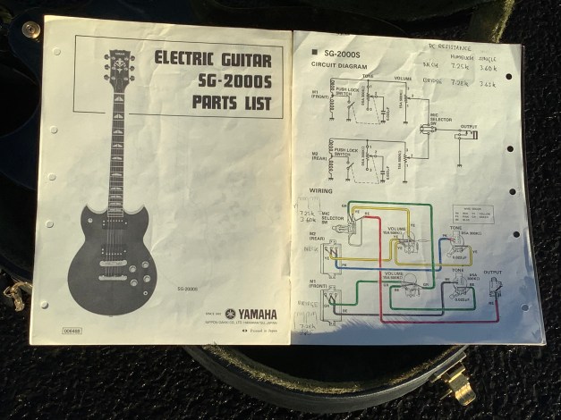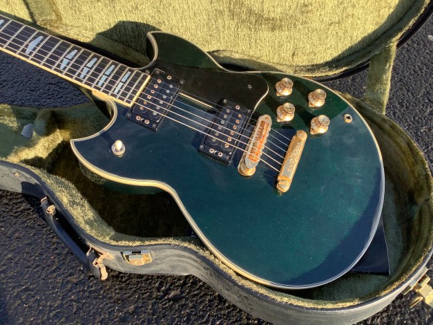 Here a Yamaha SG-2000s, a stunning Yamaha SG-2000s in translucent bottle green, it came in excellent condition. This is the -s variant denoted Yamaha SG-2000s due to the slimmer and more tapered neck and the different electrics, i.e. Coil Taps for the tone pots. The Standard SG-2000, when it was launched in 1976, came without that and only got kitted out with C/T after 1981