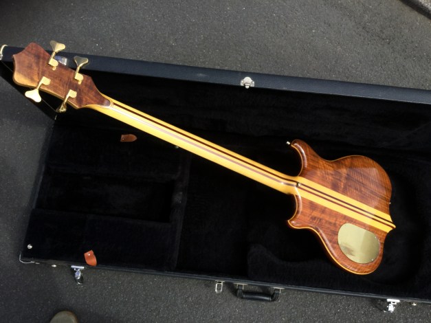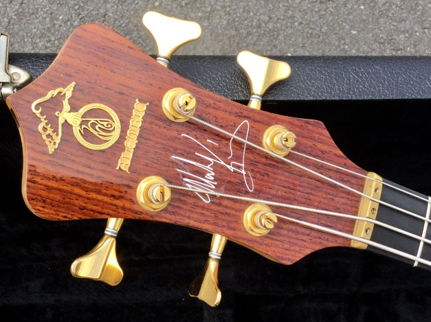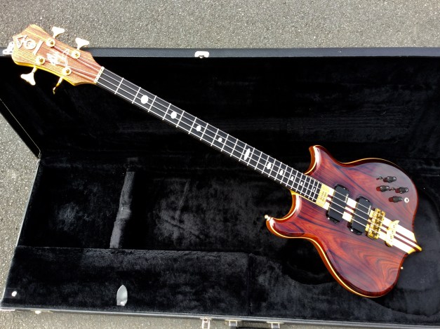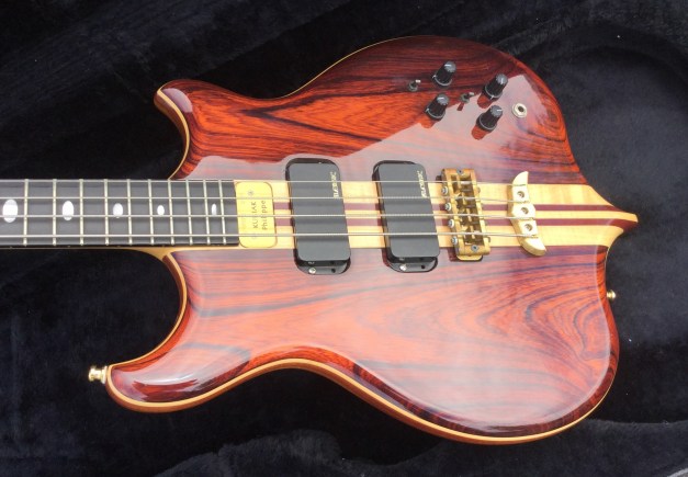 Here we have a 1991 Alembic Mark King Signature Deluxe Bass. Another cool looking bass. Neck through body, 3-piece maple neck with Cocobola wood laminates, high quality Walnut top and back, Gold Hardware, Alembic Active Electronics, 34 inch Scale Length and Ebony Fretboard. Cool example of Alembics top of the line craftsmanship. A fine playing and sounding bass. The bass is in clean condition. There is just some minimal play-wear on the bass, notably the cavity backplate. The bass lives in its original hardshell case. This is a third year example of a very hard to find Alembic model.