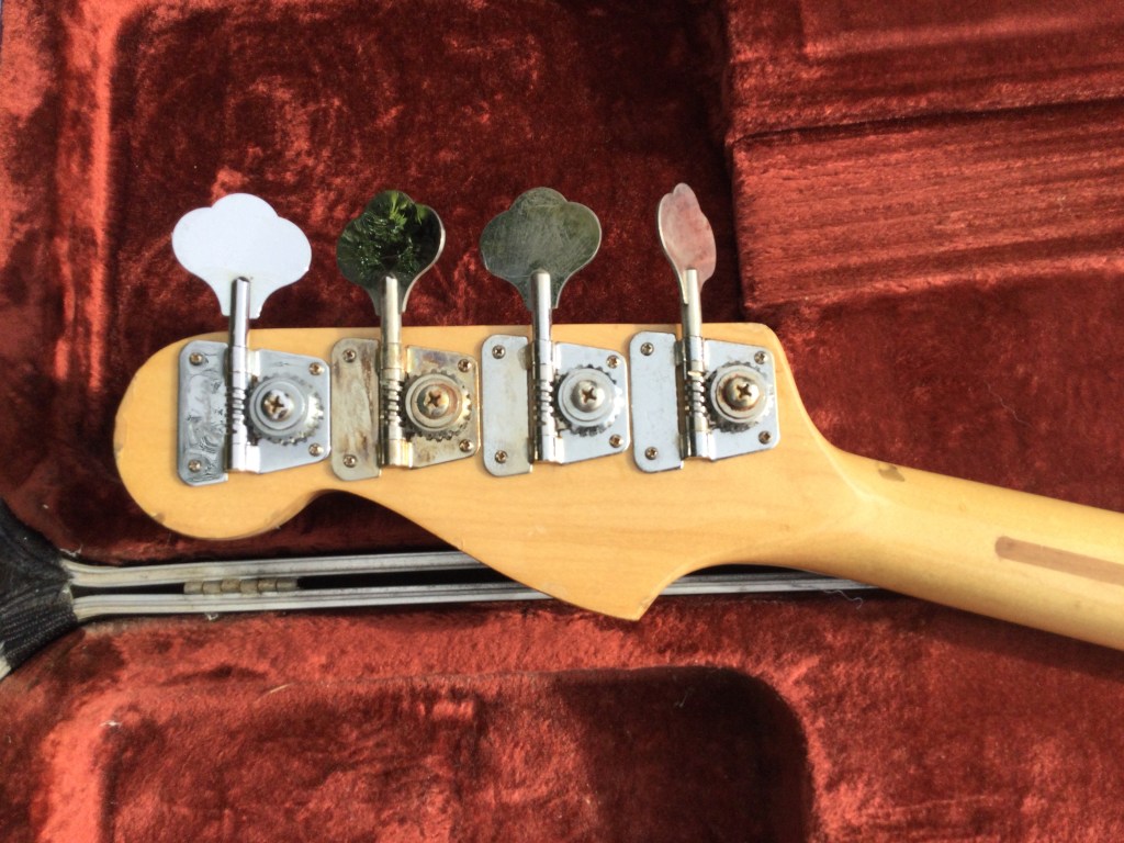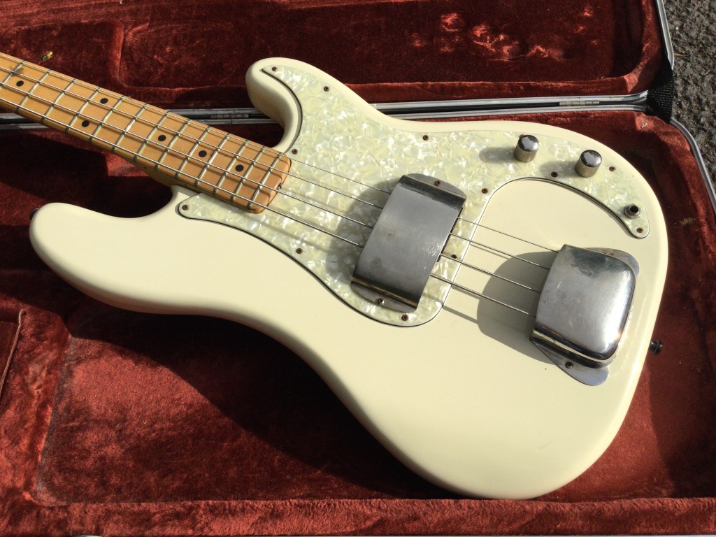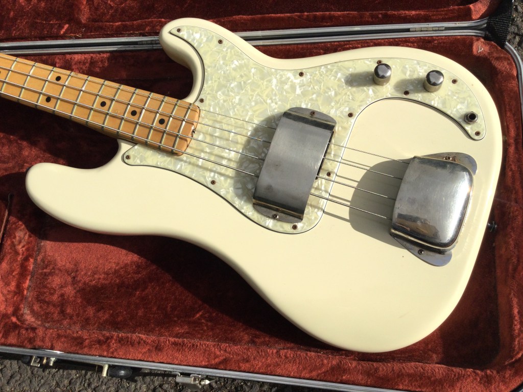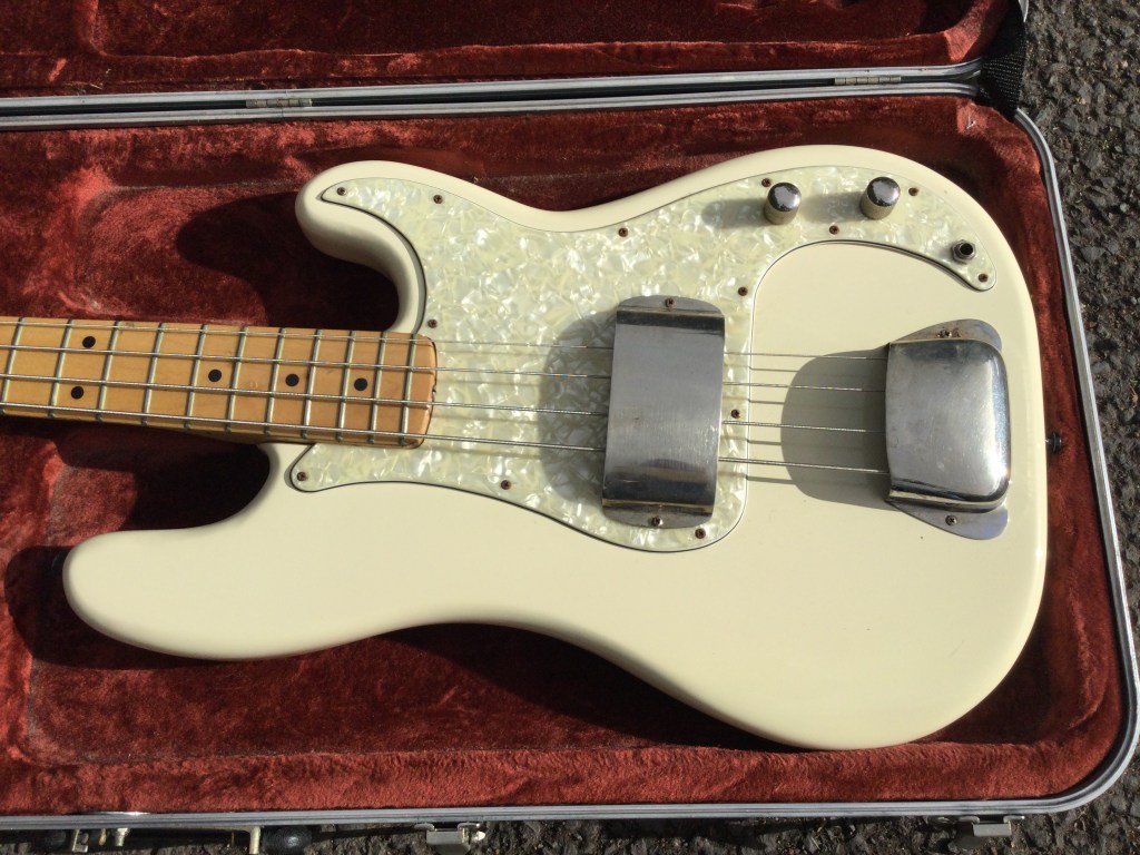 Fender Precision Bass, 1978 Made in USA, in an attractive aged cream white. Fender’s bolt on guitars and Basses were very popular since their development in the 50s, and throughout the 60s and 70s, these have been the go-to instrument of choice for many. With its classic design and recognizable tone these proved reliable and accessible. A good example is this Precision Bass. A solid bass made from alder with a maple board. Great looker with the aged cream and the slightly tarnished nickel hardware. Bass lives in its moulded case.