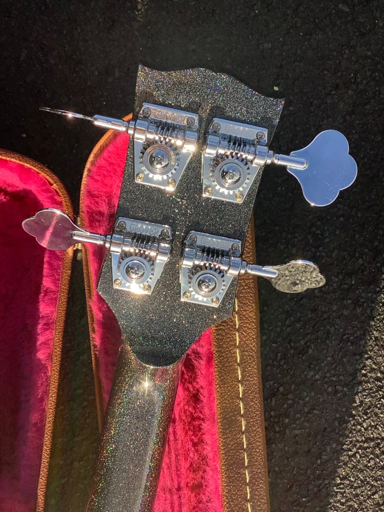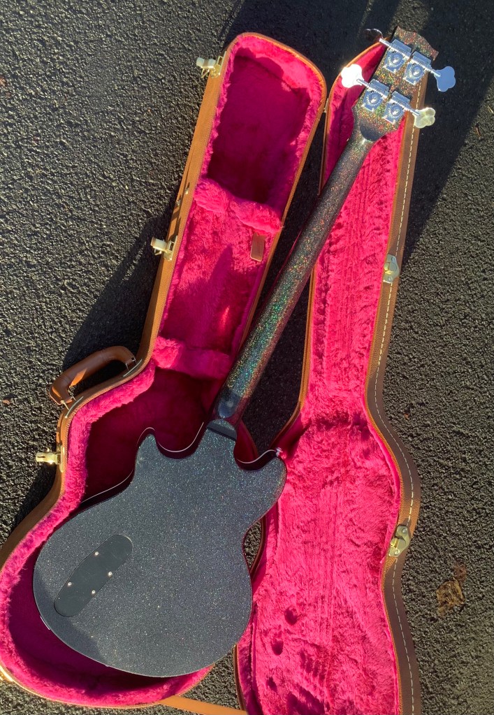 Here an uncommon Gibson Bass, the Midtown Signature Bass guitar, made in USA in 2014. This is in a black pearloid sparkly finish. Like it’s offset predecessor, the Les Paul signature models from the 1980s, this has an offset body albeit non- arch top like and a flat acoustic body section.great guitar, and not common at all. This model appeared from 2014-15 and was issued in gold flake, black sparkly and Pelham blue.it’s semi hollow and relatively light weight. Lives in its case..