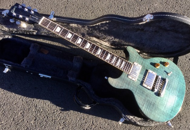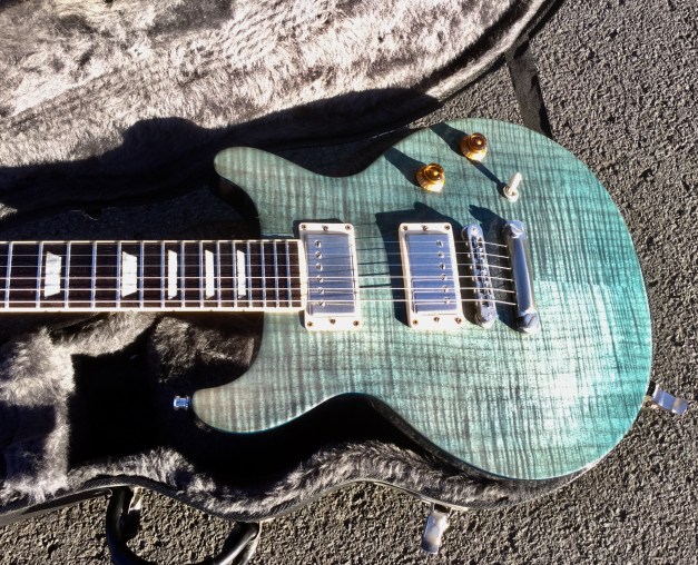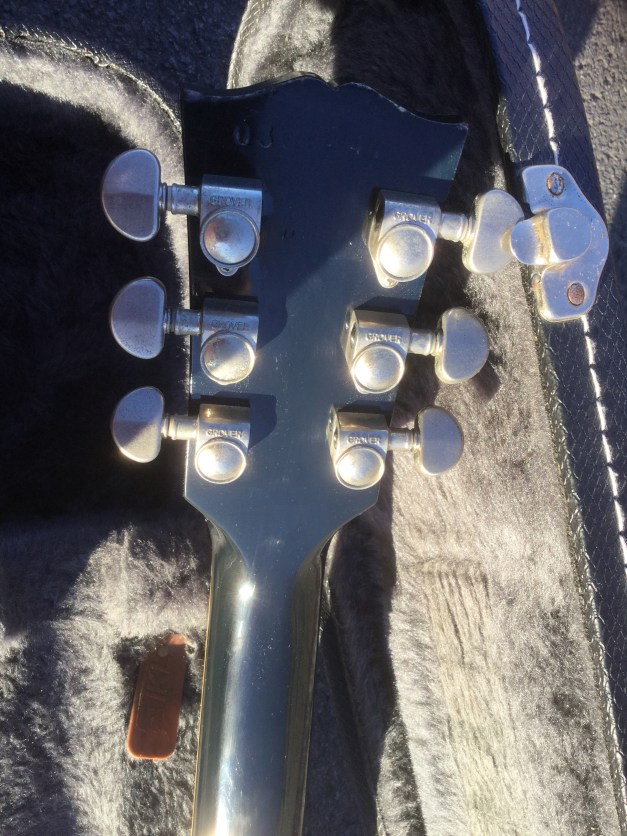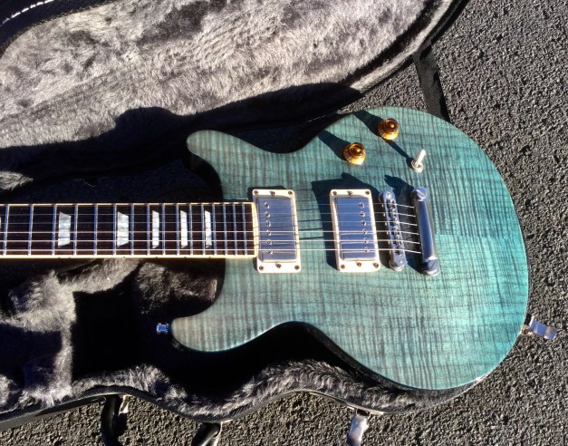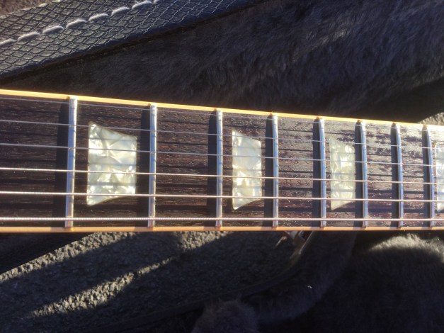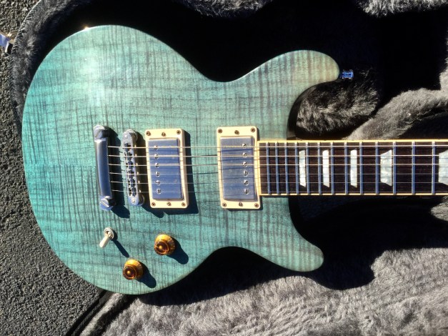 Here a modern unusual guitar the Nancy Wilson Nighthawk Standard, loosely based on Gibson’s Les Paul model but with a deeper single cutaway and a longer scale length of 25inch. Its top is figured maple, and back is mahogany. The guitar has a bound fingerboard of solid rosewood, with parallelogram position markers. The nut is Corian. The Nighthawk Standard is quite a versatile guitar with a Mini-Humbucker in the neck position, able to make a bit of growl, the Hum-bucker in the bridge position can do some serious crunch also, as well as clear tones. All this is run by a five-way selector switch to select either full humbuckers or single-coil sounds, and a range of mix tones too. The guitar is quite light and still resonant and sustains surprisingly well no doubt helped by through-body stringing and heavy bridge. Great guitar.
