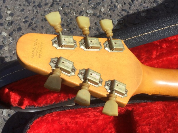 The guitar sports a body shape rather like a Les Paul, but has a bolt-on neck. The body and neck are made from poplar wood and hard maple and the instrument is finished in clear satin lacquer, allowing to see the underlying wood grain. There are three distinct tone settings on the Marauder’s selector switch. The pick ups are a classic Bill Lawrence design with the front pickup is similar to the Super Humbucker with small additional magnets reinforcing and directing the field, while the bridge pickup has a single, iron-cored coil, with a magnet below and iron strips from the lower magnet pole. The fast, easy-action neck is made from Canadian maple. The fingerboard is made from rosewood with dot inlays and the distinctive peghead headstock is of “Flying V-series” design.