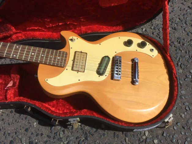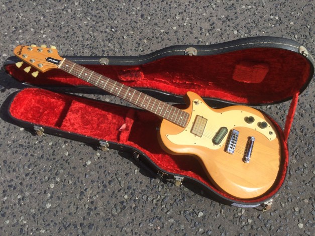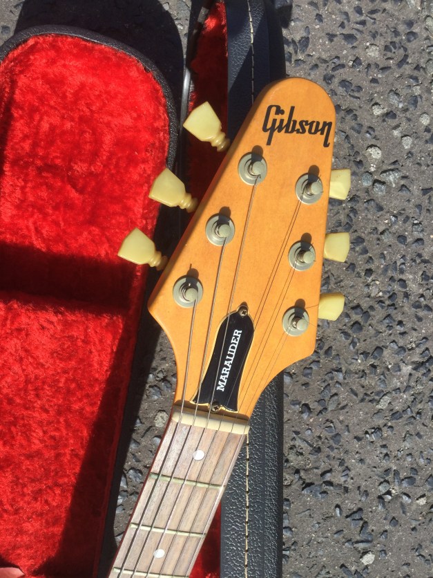 Here another Gibson Marauder, a product of Gibson innovation with Bill Lawrence. The Marauder line was launched in 1974 and remained in production until 1979; being replaced by the Gibson Sonex series around 1980. This Gibson type guitar was initially produced at the Kalamazoo plant, but gradually production was transferred to the newer Nashville plant. The Marauder, along with the Gibson Grabber Bass were Gibson’s mid-seventies budget guitar models; still a Gibson, and not cheap, but certainly not their lowest price electric; though there was a more up-market version, the Marauder Custom,