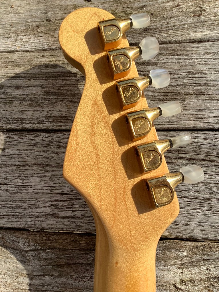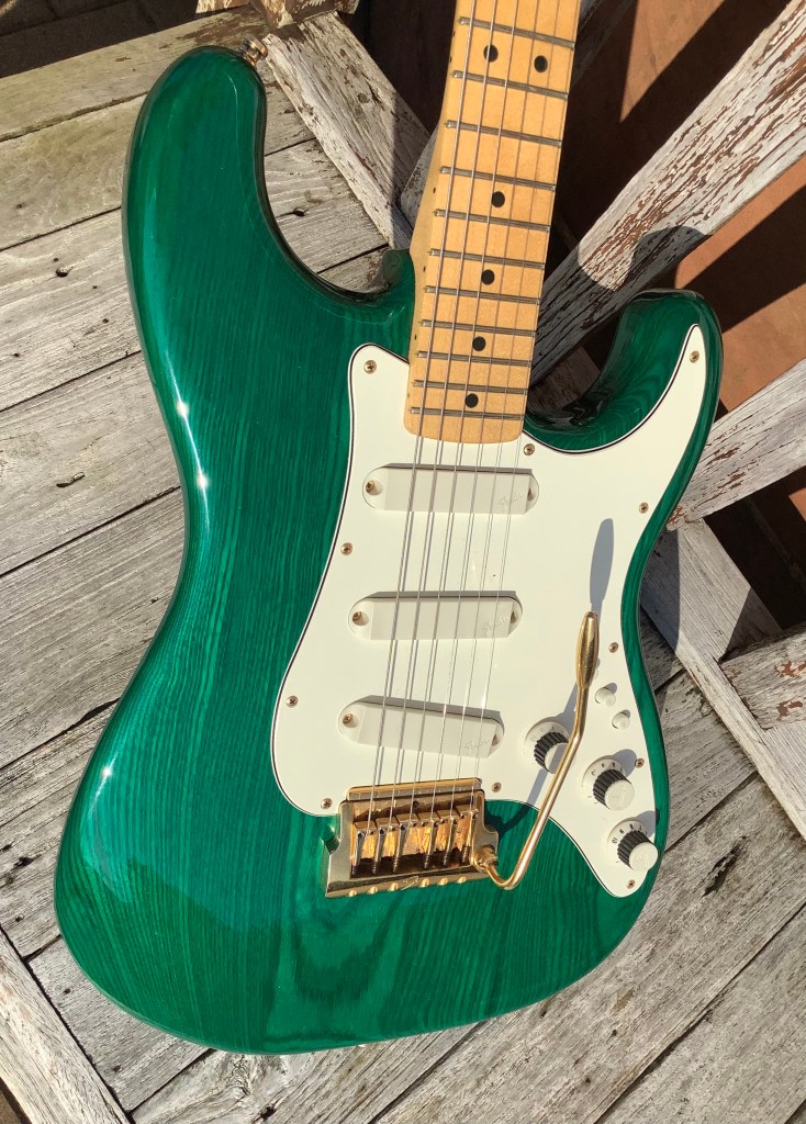 Here we have an uncommon Fender Elite Stratocaster 1983 in a rare translucent green finish. The Elite Stratocaster was a guitar design aiming to integrate active electronics into an upgraded Stratocaster design. While sharing many elements with a traditional Stratocaster, the Elite model used a different tremolo bridge and tremolo arm system. As for the sound the guitar has individual push pickup selectors and EQ-boosting TBX and MDX circuits allowing for active/passive selection and a wide sound spectrum. The Elite Strat was only produced for two years from 1983-85, but the later Stratocaster Plus does share some features with it. This guitar is quite a bonny looking machine with the translucent green showing the underlying wood grain. Guitar lives in its case.
