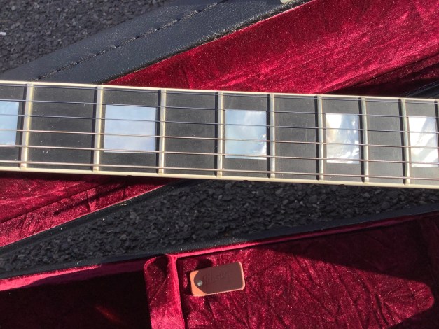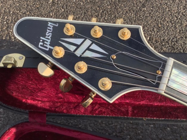 Here a Custom Shop, Gibson Flying V Custom in black with fancy block inlays. Spotted this Custom V and had to get it, turns out a hell of a great sound , clean etc, and also quite crunchy when put in overdrive. Despite the quite flat wide neck, the guitar plays superb and I consider it one of the best playing Vs. The strings are placed in a body thru fashion giving it more sustain. Guitar lives in its custom case, built like a boat.
