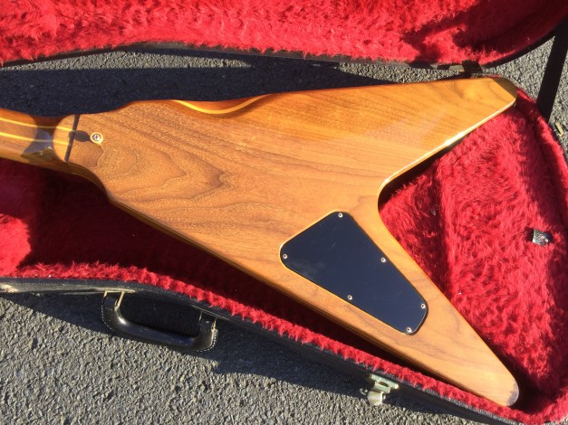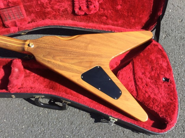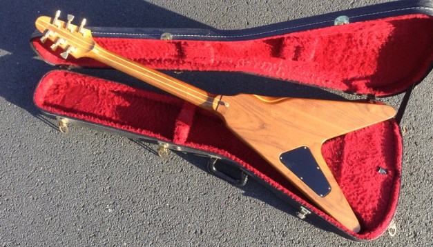 Generally, the V2 model has the general shape of previous Flying V’s but the V2 sported a 5-layered sculptured walnut and maple body. Initially these guitars came in either Maple or Walnut for the top & bottom layer known at Gibson as the “Sandwich”. This model is less pronounced “Walnut” than the other V2 in the collection but nevertheless a great guitar.
