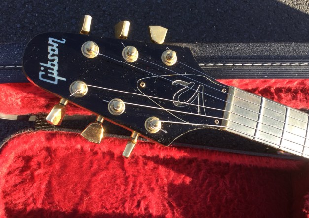 Knobs were moved off the pickguard, and a Pearl Gibson logo was inlaid into the black headstock, along with gold Gibson Tuners. Two solid brass 5/8 studs known as the “Sustain Sisters” were fitted into the body to anchor the “Tune-o-matic” Bridge along with a brass nut and brass V-shaped tailpiece. It was thought this would aid sustain and tone of the V2.