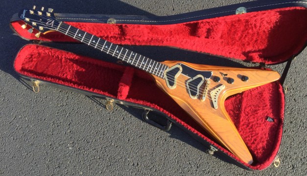 Here a Gibson Flying V2, an 1980 model of experimental design V design with boomerang shaped Tim Shaw inspired humbucking pick ups.