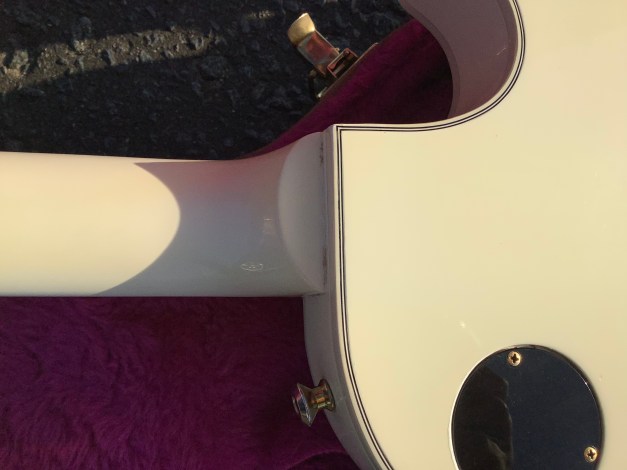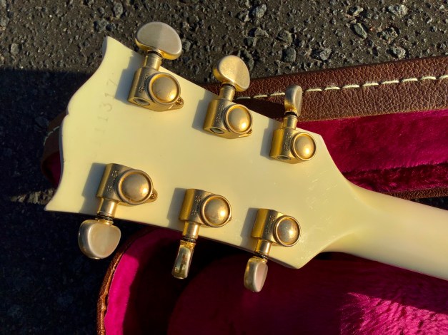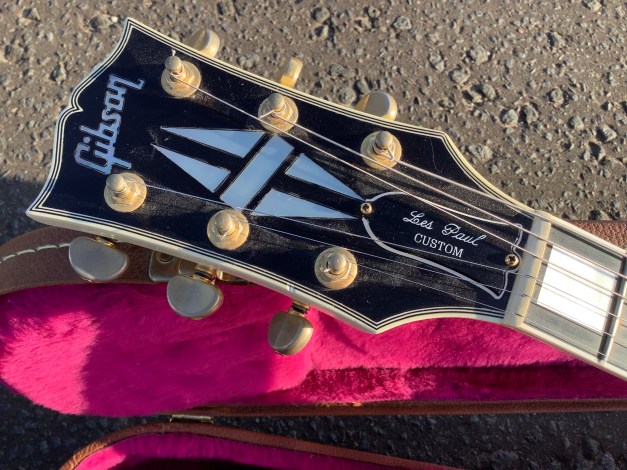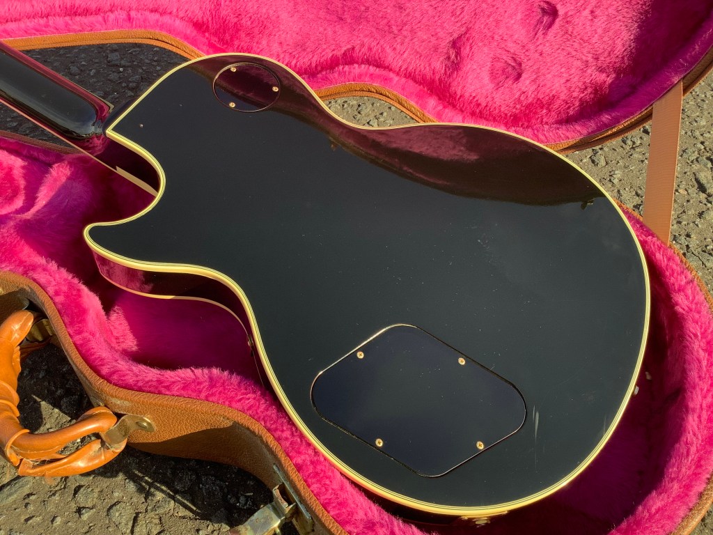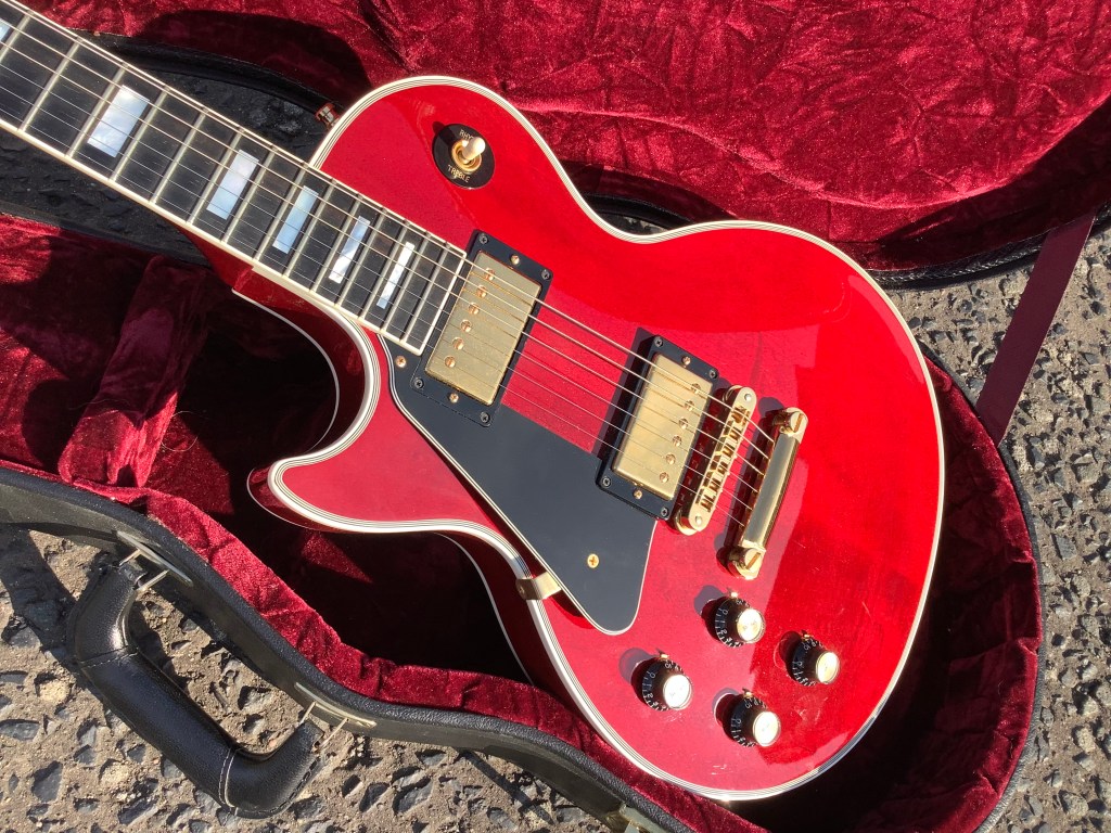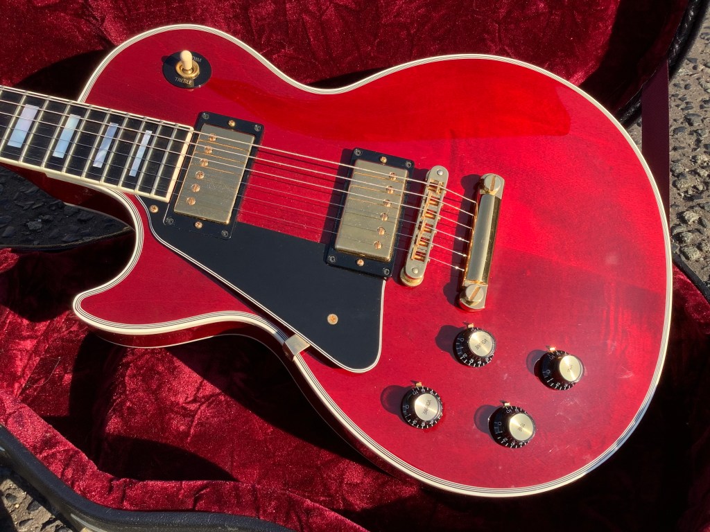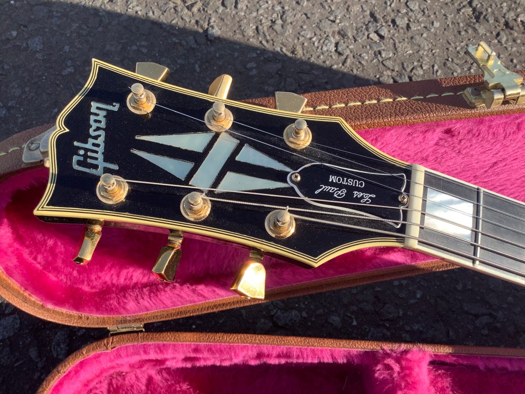 Here a classic black beauty Gibson Les Paul Custom in a glossy ebony black finish. It’s a 1989 model and is a superb example of this classic model. This Les Paul Custom is in excellent condition with only a hint bit of tarnishing giving it some fine patina. The guitar is quite heavy with no weight relief whatsoever and feels like a real guitar. The guitar has a twin set of humbucking pickups, with brass plated metal covers, and combined with the the rest of the hardware also brass plated gives it a classic black and gold look. The guitar is in excellent condition, and appears to have only been sparingly used. The sound is nice, clean and over driven, making it a real winner. The fretboard is dark ebony and the mahogany C-shaped neck plays smoothly and light. Guitar lives in a brown hard-case.