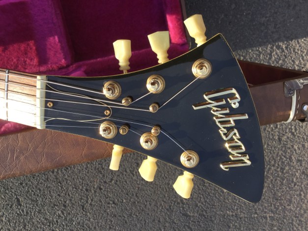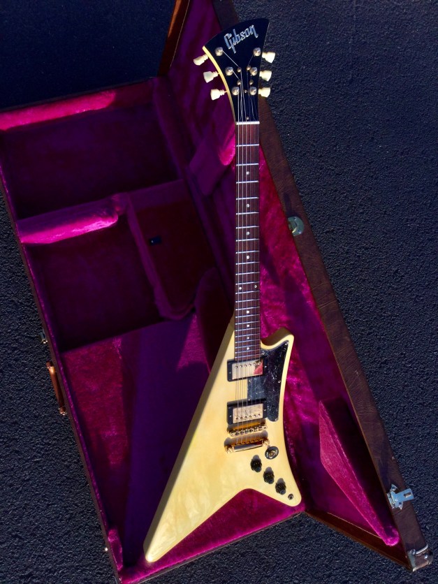 During my quest for uncommon Gibson guitar models, I stumbled upon the uniquely shaped Gibson Moderne, crafted in the USA in 1982. This model is believed to be part of the innovative designs from the 1957-59 era, which included the Moderne, Flying V, and Explorer. To date, no 1957 Moderne has surfaced, with the nearest equivalents being the 1982/83 reissues. Presented here is an exceptional 1982 specimen in Korina wood with a Cream White finish. The guitar boasts an impressive appearance and equally remarkable sound, thanks to its two Tim Shaw pickups, configured with a dual volume and single tone control, plus a pickup selector switch. Capable of producing both grungy and clean tones, it features a slender neck with a rosewood fretboard. The headstock is club-shaped and adorned with numerous string tees that lead to the tuning machines. This guitar is housed in its original case.