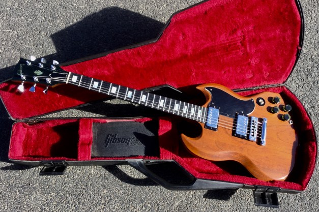 Here a great guitar from the Gibson stable, the Gibson Les Paul 61 reissue basically the then new SG shape. This guitar remained in production ever since byt lost the LesPaul affiliation and name in 1963 upon Les Pauls insistence. Thebody and neck are made from mahogany, the guitar has the usual double-cutaway style with bevelled edges. Great playing axe with a lighter weight than the Les Paul, still great resonance and sustain. Dark rosewood fingerboard with a cool look and feel, two PAF-style ’57 Classic humbucking pickups, and historically recreated and period accurate plastics.