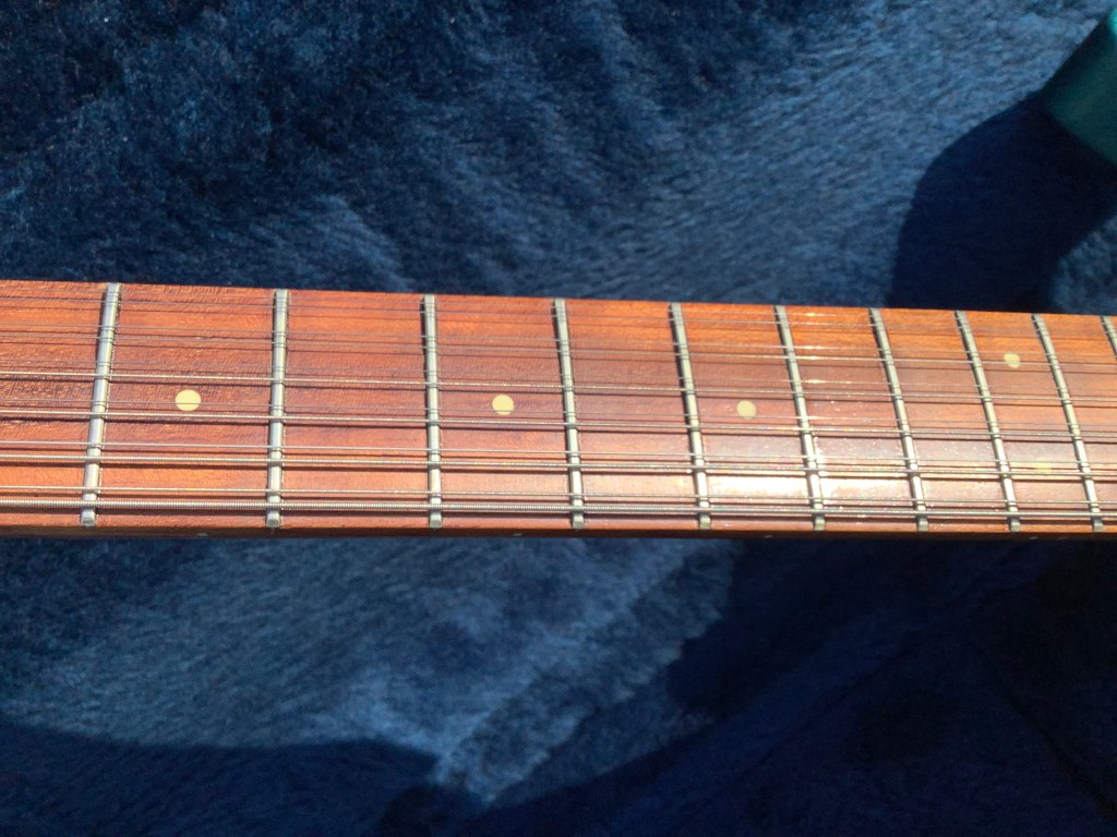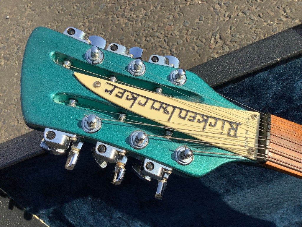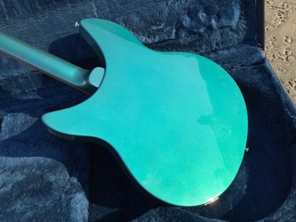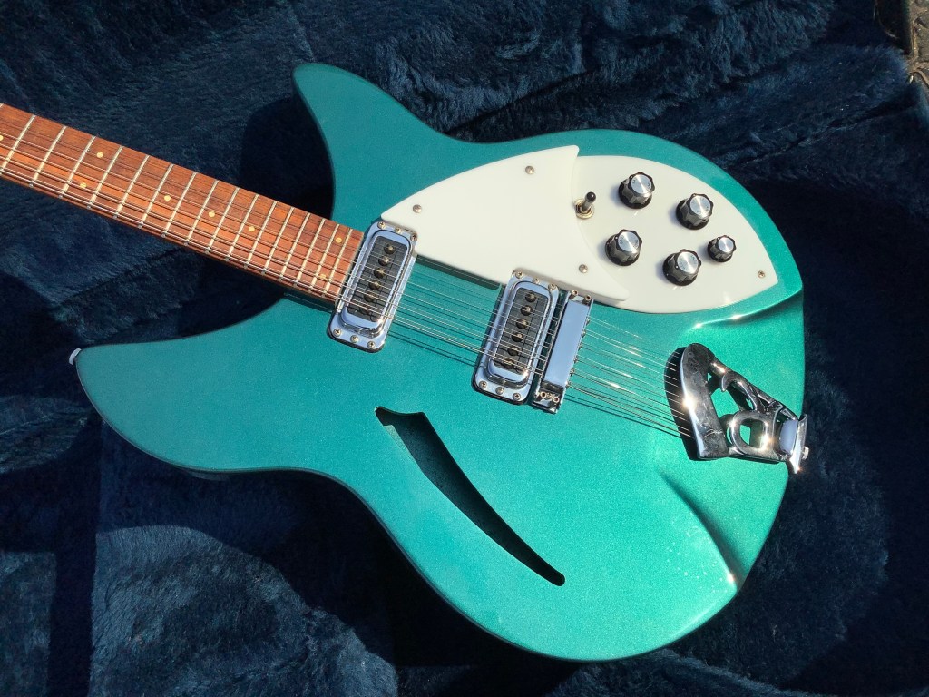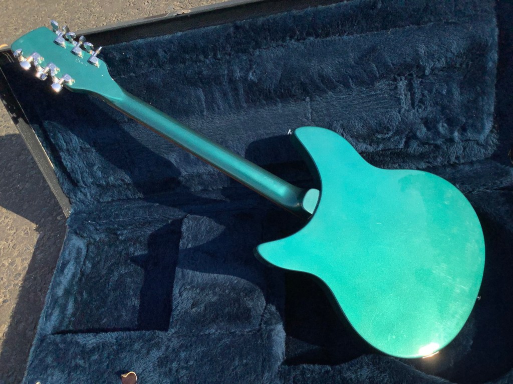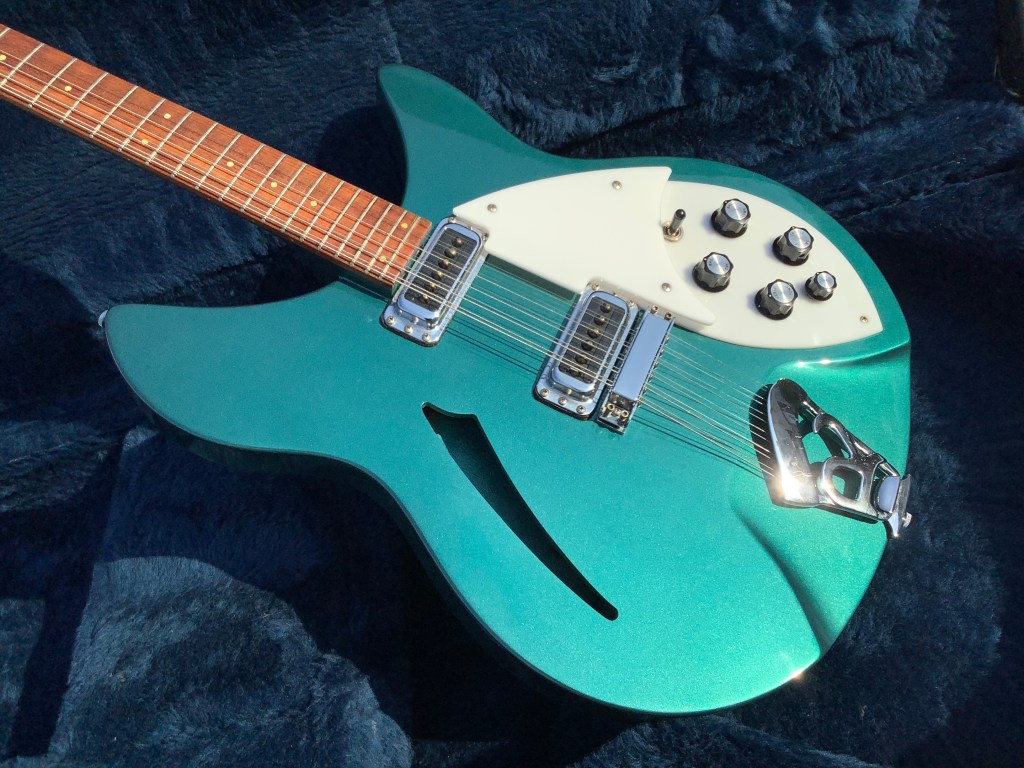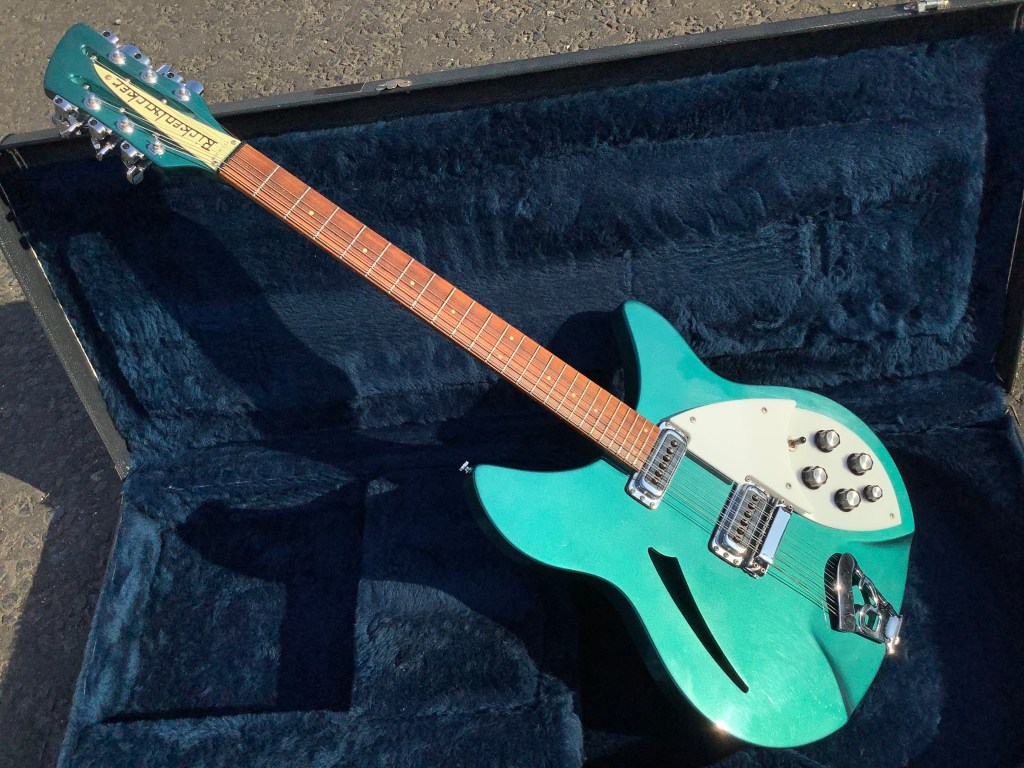 Here a Rickenbacker 330/12 in a Metallic Teal finish, made in USA in 1992 and is a stunning guitar. The 330 design appeared in the 1960s and has been updated over time to incorporate modern upgrades like Schaller tuners and Hi-gain pickups. The guitar has a classic sound and has the now well recognisable Rickenbacker look. The sound is quite twangy and made a a house hold tone by bands like the Jam in the 1980s. The neck has an easy accessible 24 3/4″ Scale Length, a bit shorter than the average Fender Strat, but bang on the Gibson LP range. The guitar body and neck are typically made of maple and the fingerboard is lacquered rose wood. Tuners are Schaller chrome type tuners. Guitar lives in its hard case.