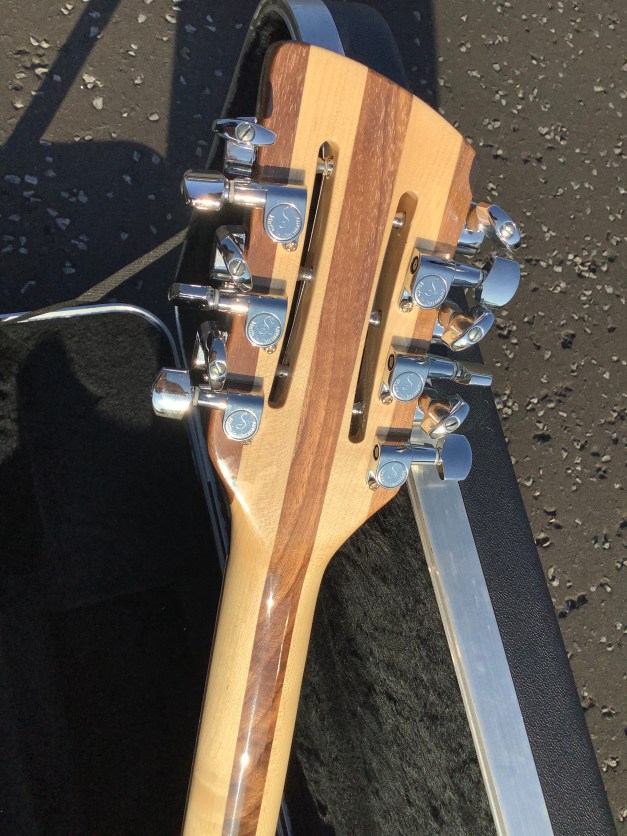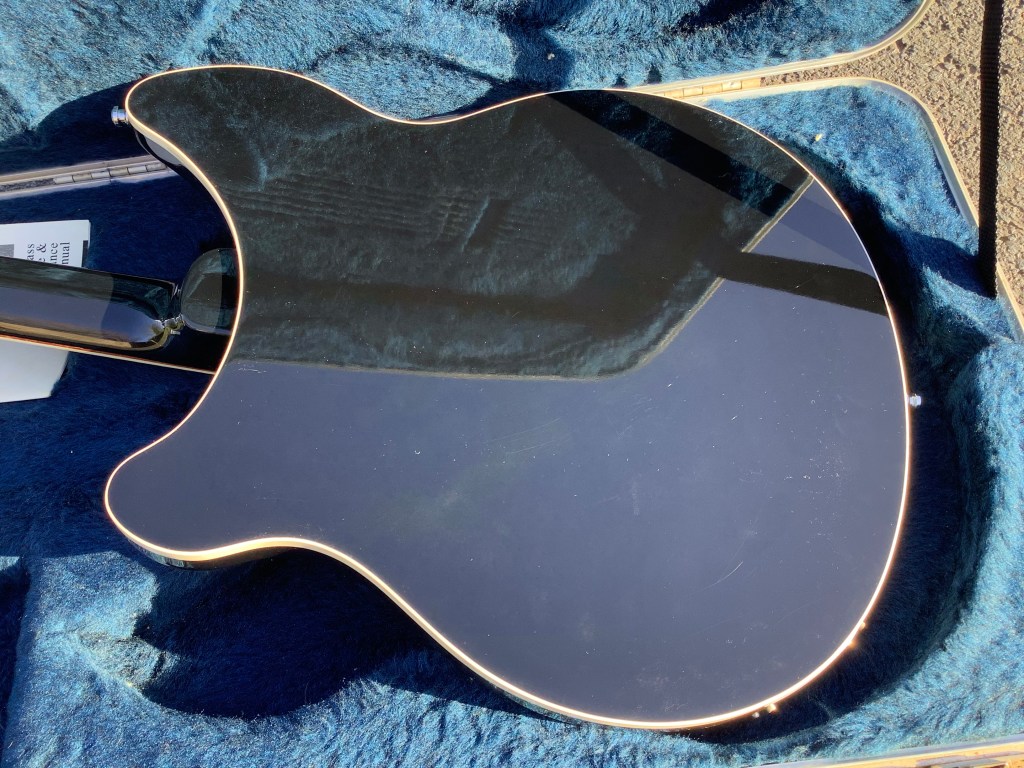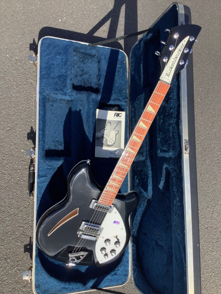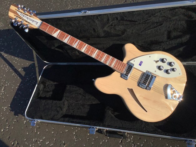 Here a Rickenbacker 360/12 in Mapleglo, made in USA in 2009 and is a stunning guitar. The 360 design appeared in the 1960s and has been updated over time to incorporate modern upgrades like Schaller tuners and Hi-gain pickups. The guitar has a classic sound with definite Roger McGuinn vibes and has the well recognisable Rickenbacker look. The sound is quite different from a 330 inasmuch that there appears to be a higher output, these Hi gain pickups are according the spec sheet, more tightly wound and have exposed adjustable pole pieces to achieve a fatter tone. The neck has an easy accessible 24 3/4″ Scale Length, a bit shorter than the average Fender Strat, but bang on the Gibson LP range. The guitar body and neck are typically made of maple and the fingerboard is lacquered rose wood. Tuners are Schaller chrome type tuners. Guitar lives in its hardcase