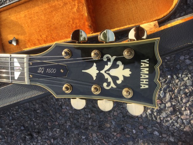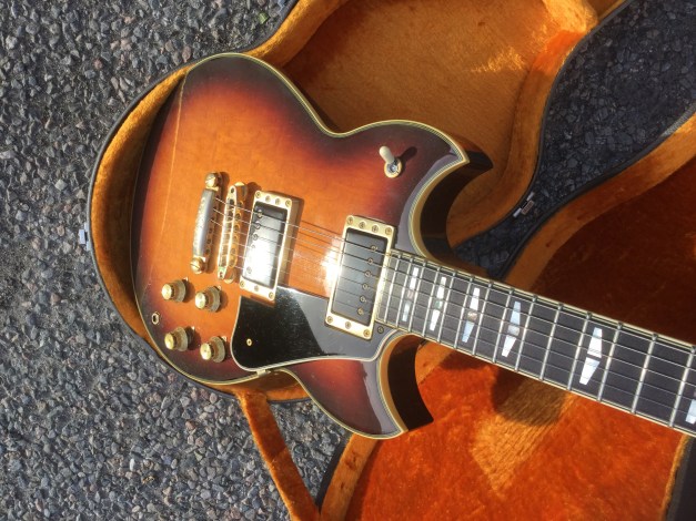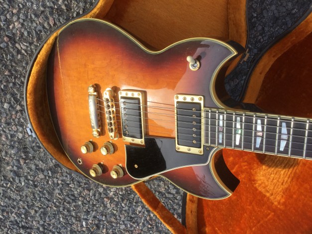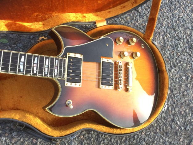 Here another example of the rare Yamaha SG-1600 in translucent wine burst finish, in near good overall condition. The only flaw is some aesthetic clouding of the finish which is a reaction of the paint with the moisture in the wood, a process which is accelerated with UV light such as string sunlight and very common to the 1980s SG range. The SG-1600 is an upgrade from the SG-1000 and early SG-1500 model and built from maple and mahogany with a mahogany set neck. The fretboard is bound rosewood with mother of pearl/abalone split wing style inlays. Typical weight of these models was around the 4.2 kgs. The sound of these vintage gems is outstanding, produced by a straight 2 tone/2 vol arrangement with a coil tapping option and a 3-way pick up selector switch. Hardware was gold plated with a gold stop bar. The sound of this model is full, produced from 2 Spinex covered humbuckers, which have a strong presence, ideal for rock and rhythm. Guitar is all original and lives in its original lined hard case. Weight is about 4.5 Kgs