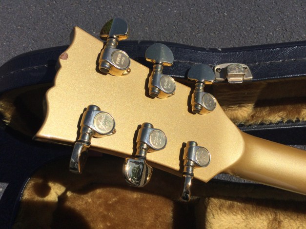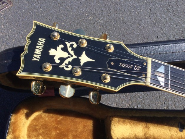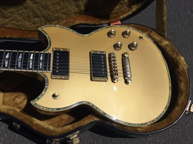 Here a Yamaha SG-3000s in metallic gold, finish made in 1985. The Yamaha SG-3000s, alike the SG-3000 is the top of the Yamaha SG line up and an upgrade from the SG-2000 model and built from maple and mahogany with a mahogany thru body neck in a so-called “T-cross construction” mode. The fretboard is bound ebony with mother of pearl/abalone split wing style inlays. Typical weight of these models was around the 4.4 kgs. Hardware was gold plated with a gold stop bar. Unlike the SG-2000, the SG-3000 does not have a brass sustain block under the bridge and the bridge is a narrower type than the SG-2000 models. The sound of this model is strong, coming from 2 open humbuckers. The electronics are controlled with 2 Amber Speedial 2V/2T Push/Push Coil Tap on tone pots and a 3 way toggler switch. The guitar stands out with the finish topped off with elaborate binding in abalone. It once more demonstrates the Yamaha luthiers’ craftsmanship. The Yamaha SG-3000 is considered by many to be the ultimate SG.