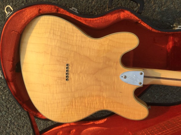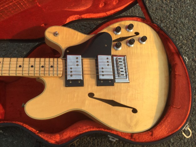 Here we have a 1977 Fender Starcaster, an offset semi-hollow body electric guitar made by the Fender company. The Starcaster, lik3 this natural wood example, was part of Fender’s attempt to enter the semi-hollowbody market, which was dominated by Gibson ES-335 and similar models.