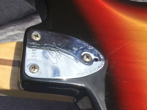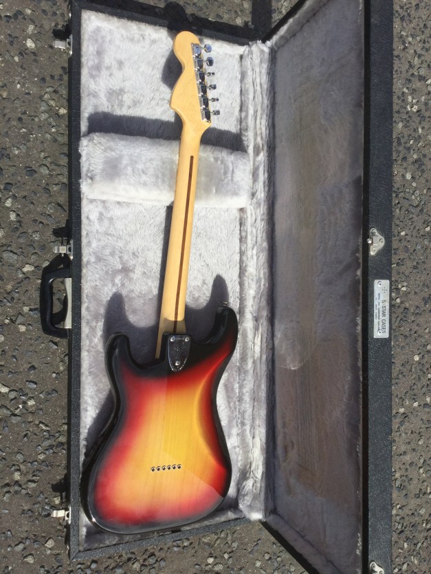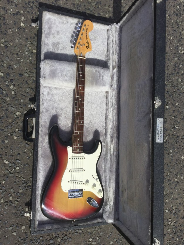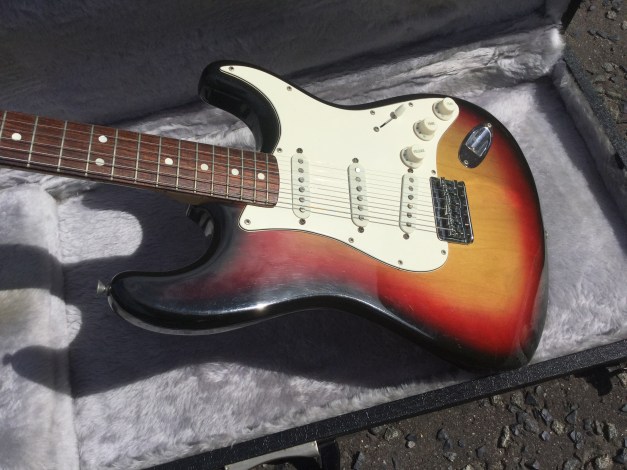 Here a well kept Fender Stratocaster Bullseye finish electric guitar. Great 1974/5 vintage guitar, but heavy. The bullseye three-tone Sunburst finish has remained crisp and clear and as result is stunning. The guitar plays very well, all the hardware operates as it should, the electrics work flawlessly. There we are, a guitar with minimal play wear. Maple neck, Rosewood Board. Great looker and a cool player.