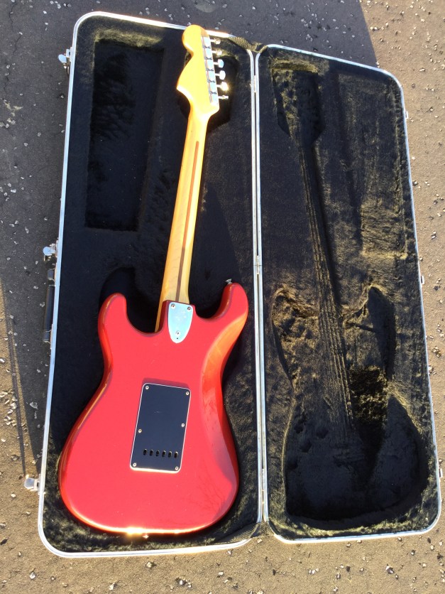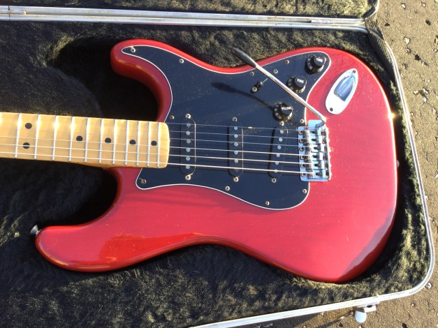 Here a Vintage 1979 Fender Stratocaster in Translucent Red. The Archetypal Fender Stratocaster Guitar, solid as a rock and around since 1954, heavy as hell but a sound to die for. One of my best 1970s Fender guitars and, apart from replaced saddles, all original, factory fitted. Defo one of the best vintage strats kicking around. Very responsive guitar and easy to play. Lovely light red coloured finish. Lives in original Fender hard-case.