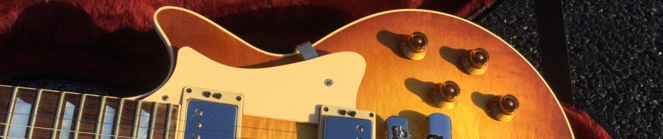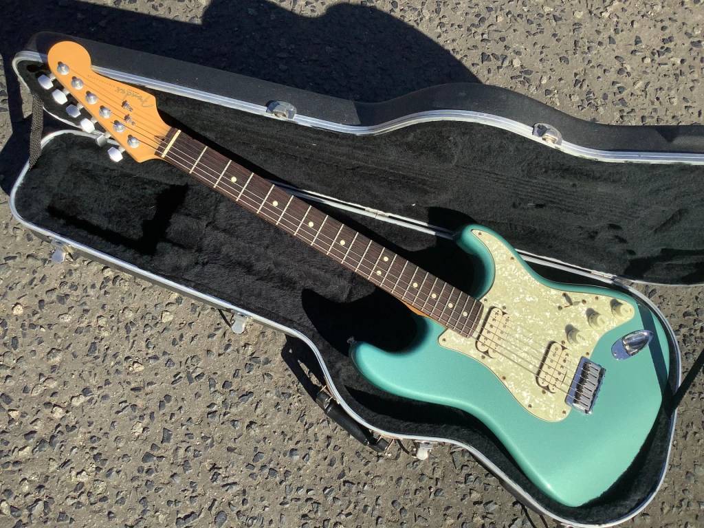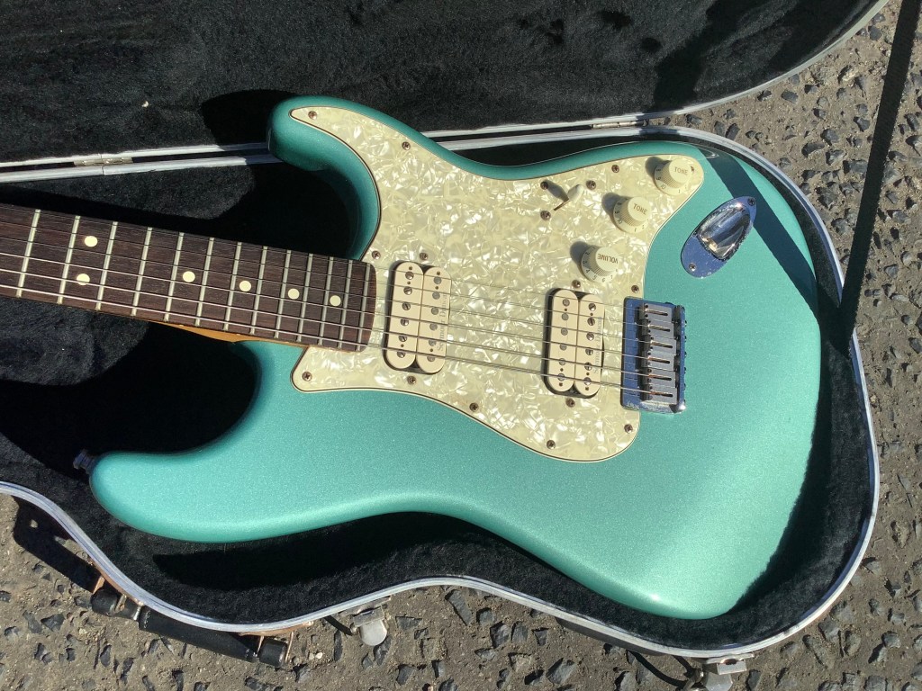 A twin-humbucker 2000 Fender in a light blue metallic finish with factory fitted Seymour Duncan Pearly Gates, high-output pick ups. One of my better guitars and supercharged, all original, factory fitted.