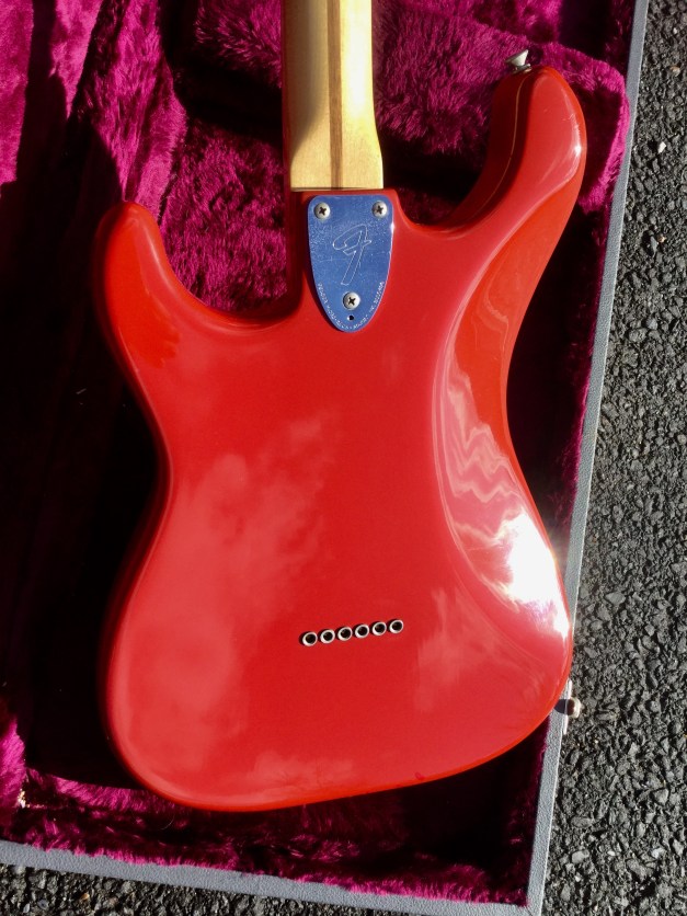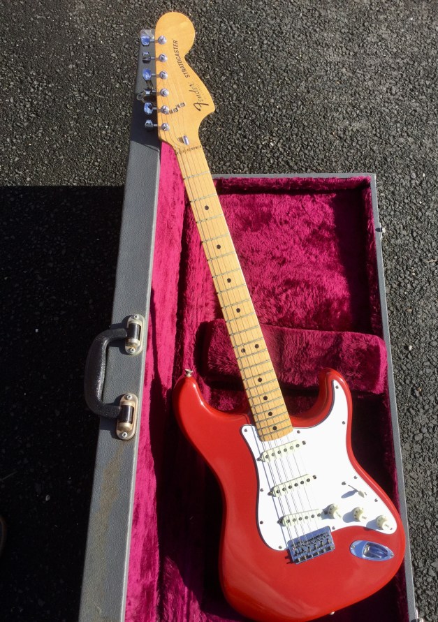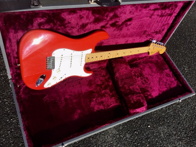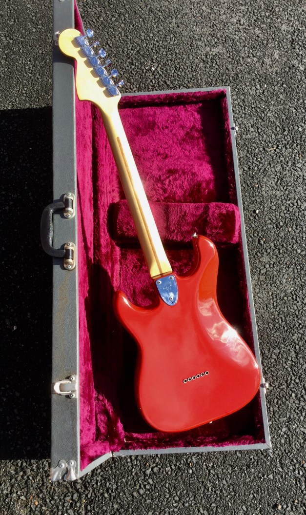 An all original 1977 Fender Stratocaster Hardtail n red. One of my best 1970s Fender guitars and all original, all bits factory fitted. Heavy as hell this Hardtail but plays lovely. Defo one of the best vintage strats kicking around. Very responsive guitar and easy to play. Lovely light red coloured finish. Near mint condition, no marks or dents. Lives in original Fender hard-case.