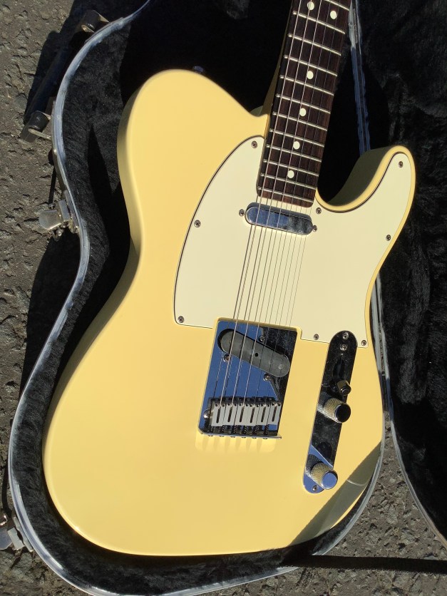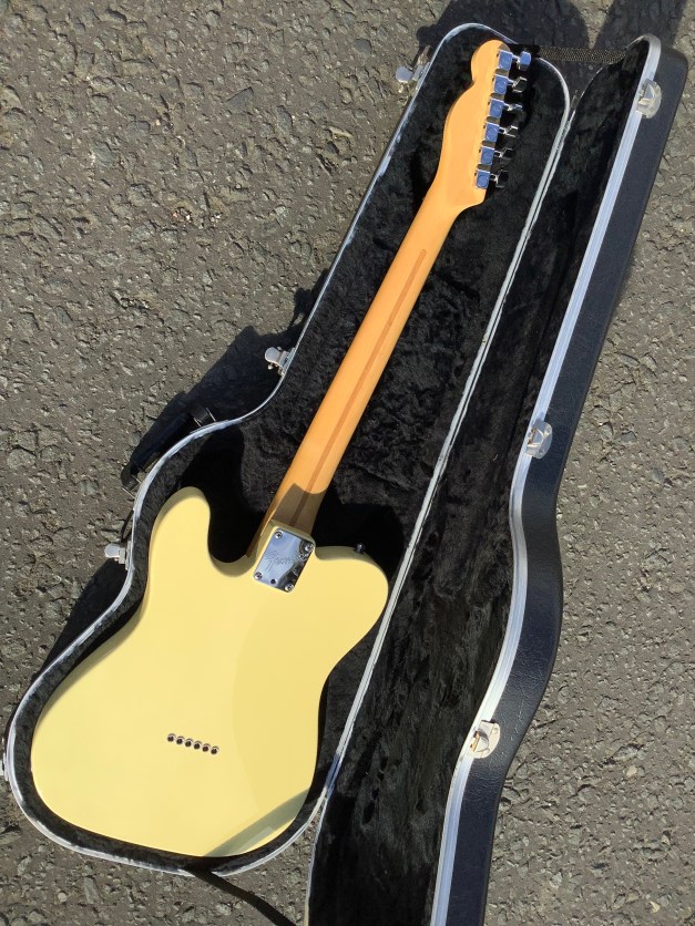 Here a cool Fender Telecaster in aged white made in USA 1994. Cool looking guitar with the white nicely aged to a yellow custard-like colour. The guitar is in very clean condition, a great looker and a killer player. Ash body with a maple neck and rose fingerboard. Collectible machine and great players gear with ounces of mojo and a great feel to it. You can find Tele’s in many colours, however, the blonde on blonde colour stands out. This one has only minor wear mark on the pick-guard from actual playing.