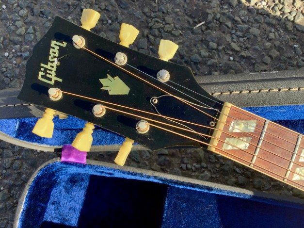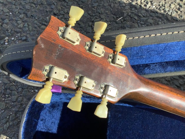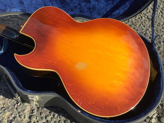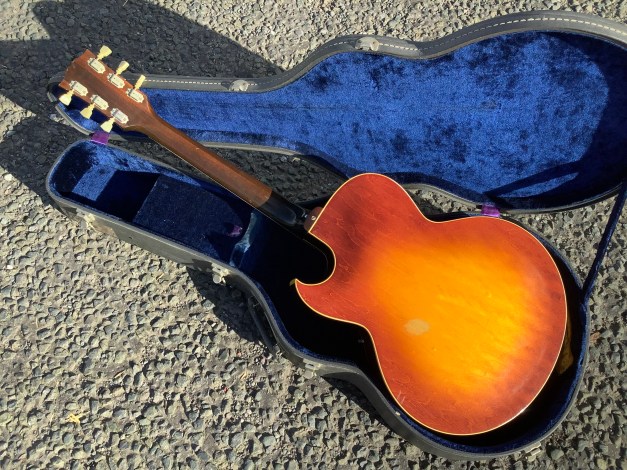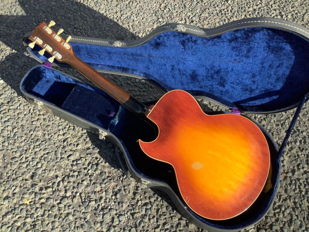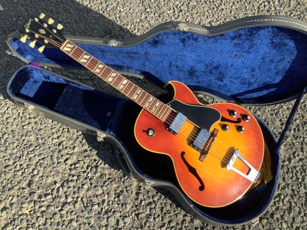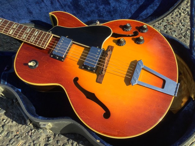 The ES-175D is a single- or dual-pickup archtop electric guitar made by Gibson. Unlike Gibson’s L5 and Super 400 guitars, the ES-175 typically was made of an all-laminate construction, which was a cheaper alternative than the existing L-5. In additional to the lesser cost, the materials selection was useful in keeping feedback at higher volumes manageable. The ES-175 typically has a rosewood fingerboard with parallelogram inlays, a 3″ deep body, a floating bridge, and the sound comes from a set of Gibson’s ‘Humbucker Pat. pickups. The fingerboard has 19 frets and tone is varied with independent volume and tone controls for each of the 2 pickups. Hardware is nickel plated. Guitar lives in its hard case.