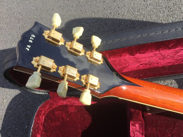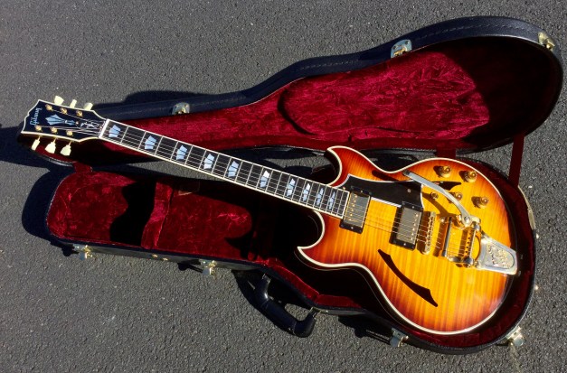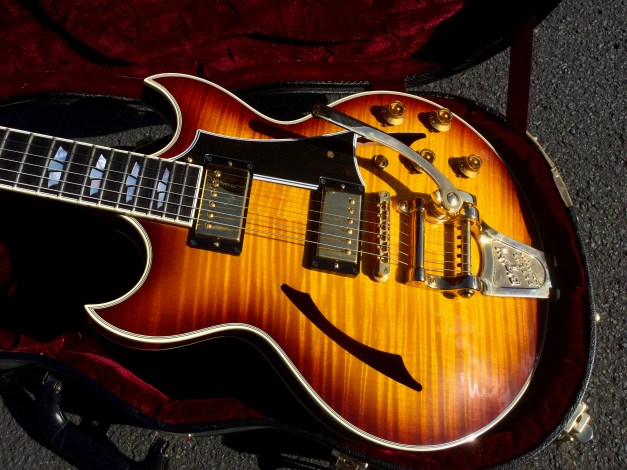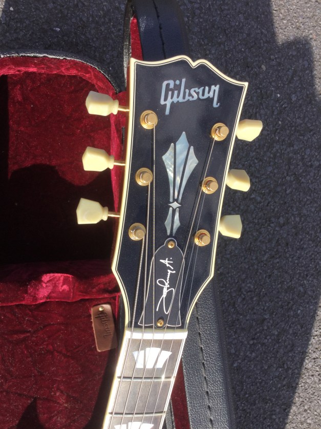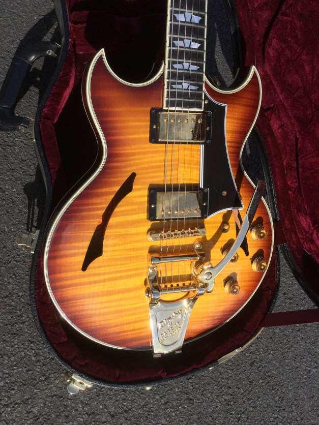 Gibson Johnny A, signature model, flame-top. This guitar appears to be a cross between a Solid Body and a hollow-body guitar and looks similar to a symmetrical but sharper pointed Gibson Midtown. Sporting a smaller body than a 335 or 339, we have a luscious looking semi acoustic guitar that plays more like a solid body guitar. The guitar has looks and plays phenomenally well. Kitted out with a factory Bigsby and powerful pickups make for a very versatile and good looking instrument. The Johnny A signature model is only issued in small numbers and a sought after Guitar henceforth. Issued as a custom shop model it lives in a plush custom shop case with purple lining.