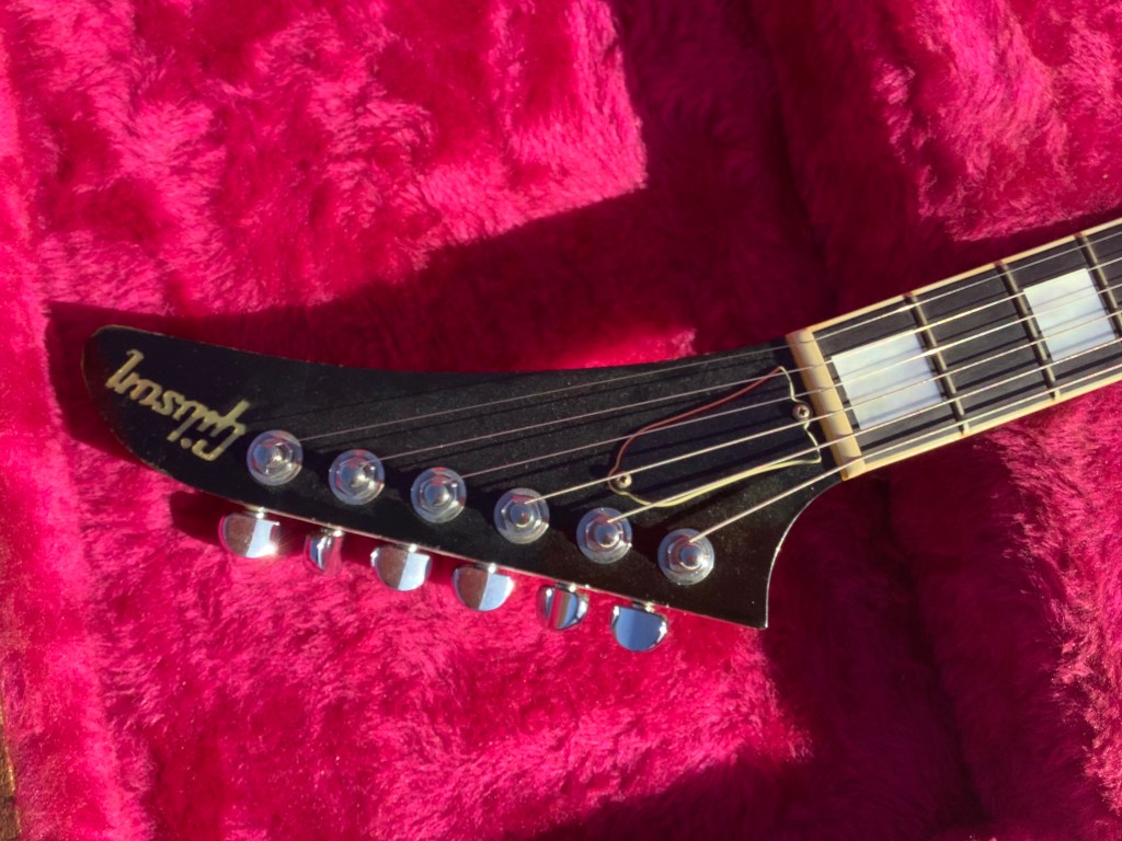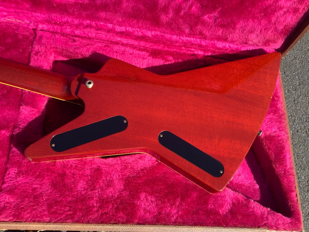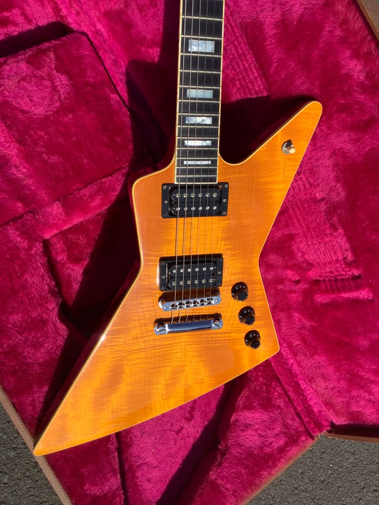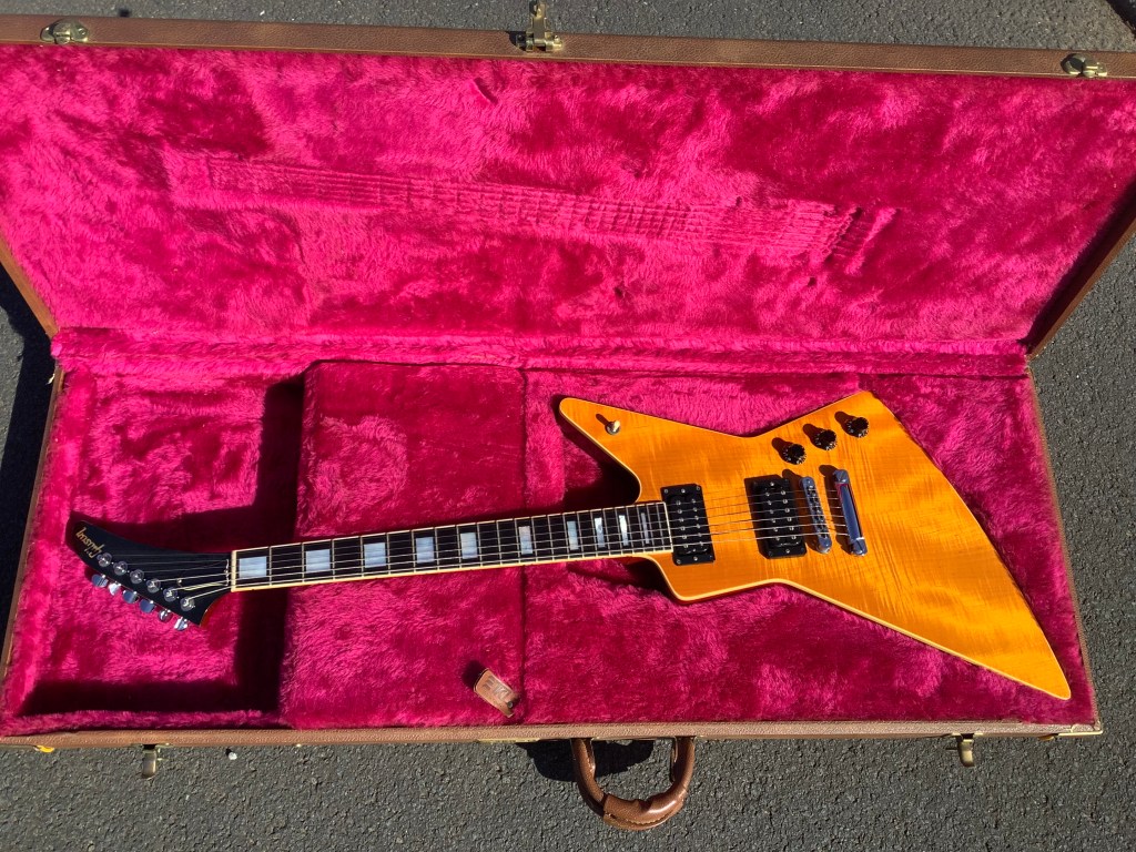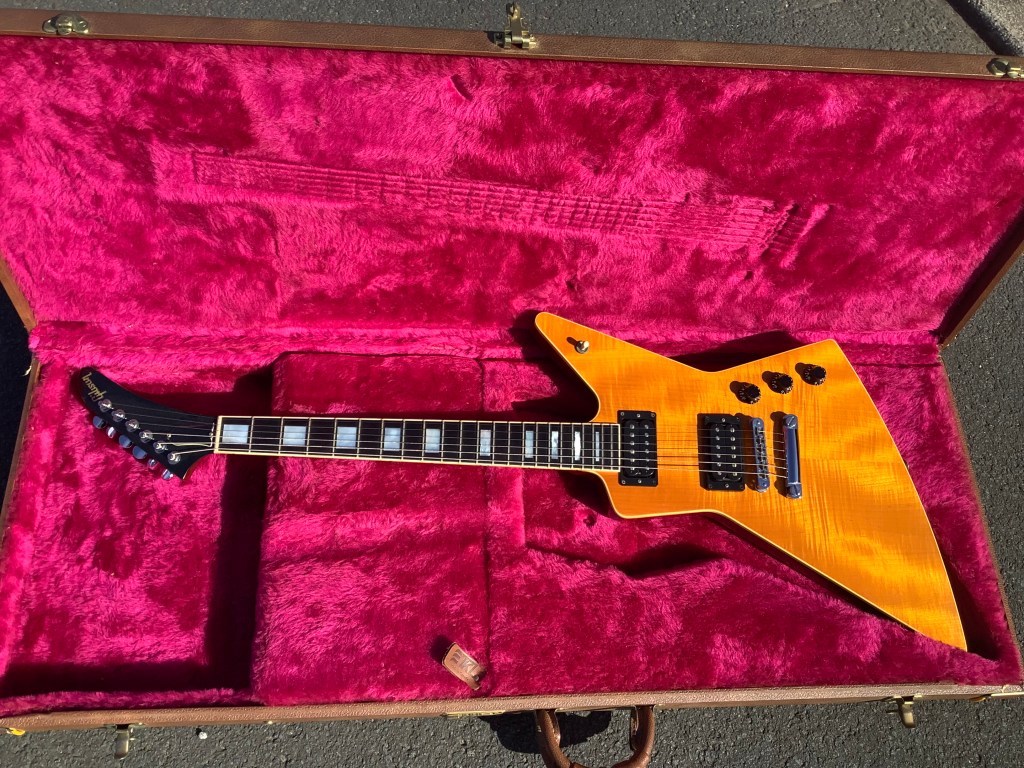 On show a 2002 Gibson Explorer Pro in a Flame Amber finish, a limited edition featuring an ebony fingerboard and a sleek, flat body. This guitar boasts an amber two-piece book-matched flame top, a bound, small-bodied Explorer with Les Paul Custom-style inlays on the ebony fingerboard, and a cherry red finished mahogany back, sides, and neck. The neck has a great feel, reminiscent of the slim ’59 profile, wide with large frets. Aesthetically pleasing, this 100% original, unaltered guitar includes the original hard shell case and paperwork. Despite its angular look, it is well-balanced and plays smoothly. Such Explorers have contributed to the iconic sound of U-2. Created in 1957, Explorers, along with Flying Vs and the scarce Modernes, are now sought-after collectibles. This particular piece resides in its rectangular hard case.