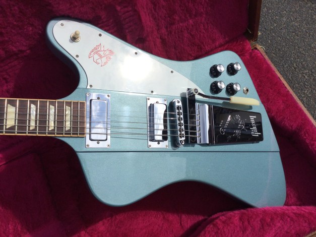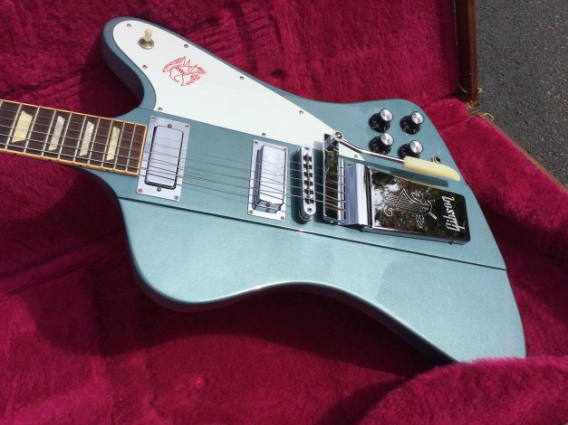Here a cool Gibson Firebird made in 2016 in Pelham Blue. This is one of a Firebird with a Lyre Vibrola made during a production run from 2016. Kitted out with two mini humbuckers, it is a cool looking tone machine. The condition is great, as it is only a few years old. Even the tan coloured case is in great nick.
