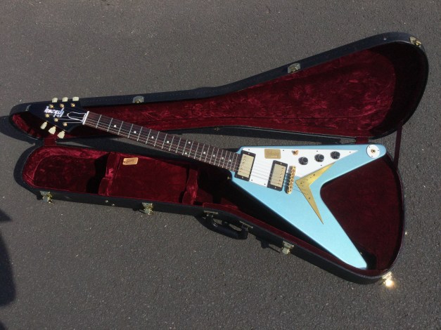 Been resisting getting a modern Gibbo V for a long time. Well here it is, as rare limited edition, Custom Shop, Benchmark ‘59 Gibson Flying V 2014 in Pelham Blue. Spotted this Custom V and had to get it, turns out a hell of a great sound over a VOX AC30, clean etc, and also quite crunchy when put in slight overdrive. Despite the quite flat wide neck, the guitar plays superb and I consider it the best playing V in my collection. The strings are placed in a body thru fashion giving it more sustain. Guitar lives in its custom case, built like a boat.