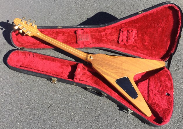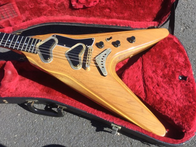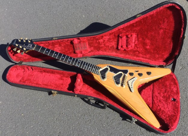 Here a Gibson V2, an experimental design V style model, loosely based on the original 1967 V. One of the Tim Shaw inspired designs after he arrived at Gibson in 1978, and also one of the experimental designs along the E2 Explorer Guitar and aptly named V2. The general shape of previous Flying V’s was retained by Gibson, but this V2 sported a new 5-layered sculptured walnut and maple body. Initially these guitars came in either Maple or Walnut for the top & bottom layer known at Gibson as the “Sandwich”. The Vol/Tone Knobs were placed off the pickguard, and a Pearl Gibson logo was put on the black headstock. Two solid brass 5/8 studs known as the “Sustain Sisters” were fitted into the body to anchor the “Tune-o-matic” Bridge along with a brass nut and brass “V” shaped tailpiece for sustain. Like this 1980/1, from 1979-1981 these models used the “boomerang” humbucker pickups that were designed to sound like single coils with lower noise whereas later in 1982, the pickups were changed to the “Dirty finger” pickups. The V2 with case retailed for US$1,199 in 1979, Gibson’s 3rd most expensive guitar. Allegedly only 157 V2’s were shipped in 1979. Besides the high price, some players complained about the non-traditional sounding humbucker pickups and the weight of the guitar. Despite all the bad press this guitar sounds cool and can do either grungy and smooth clean etc, the neck is quite slim with Ebony fretboard.