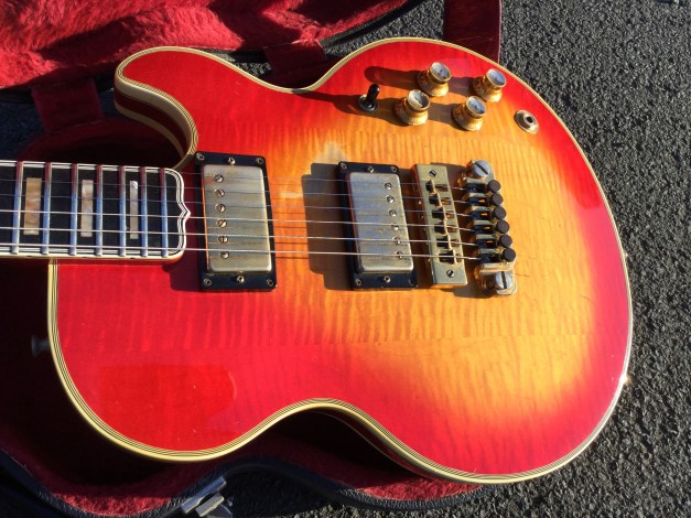 Gibson L5-s, made in USA in 1978, a solid body version of the Gibson L5. Doubly bound, flattish body, kind of Les Paul-ish, slightly arched maple top with ebony. Double-sided binding and the Ebony fretboard with real abalone. The guitar has a micro tuning TP-6 tailpiece and a classic 1970s harmonica bridge. The guitar is a luxurious mixture of mahogany with maple on the front and back and including a cavity backplate made out of matching wood. L5-s guitars were originally designed in 1973 as jazz/fusion guitar and issued out with low-impedance pickups, later versions of the L5-s came with standard Bill Lawrence TAR-back hum-buckers. Wider than the Les Paul models, the size and dimensions are like the Gibson Les Paul Recording. As this is a 1978 Model, the original case is the plastic moulded chainsaw case.