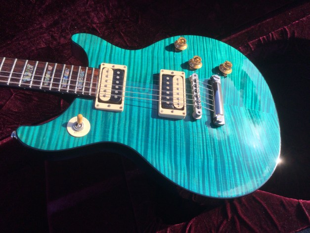 Latest addition to the Gibson DC collection, a rare and unusual Gibson Les Paul DC Standard. TAK Matsumoto model, in a cool teal Flame top finish. This is another example of the longhorn series, in a custom shop version, and issued in 2011 in very limited numbers. This model was issued in a number of finishes such as red, orange and black. Great looking glossy Burst finish on nicely figured maple double cut body. Slim profile set Mahogany neck, topped with unbound 22-fret Rosewood board with real a abalone inlays. Tone supplied by a pair of powerful hum-buckers with 3-way switch and master volume and tone.