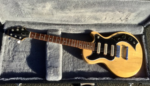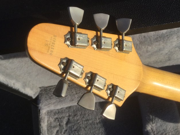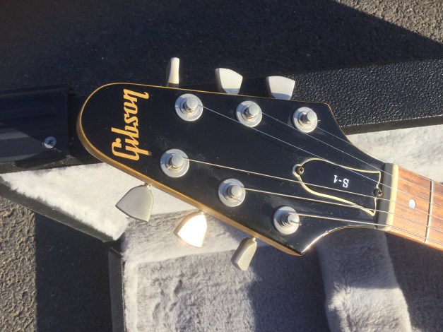 Here an example of a Bill Lawrence inspired guitar, the 1975 Gibson S-1, Unlike the Les Paul models, the S-1, like the sister model the Gibson marauder was produced in relatively small numbers, mostly due to the lesser popularity versus the set neck Les Paul models. The S-1 was launched in 1975/6 and remained in production until 1980; being replaced by the composite material Gibson Sonex series around 1980. This Gibson type guitar was initially produced at Kalamazoo, but gradually production was transferred to the Nashville factory. The S-1, along with the Marauder and the Gibson Grabber Bass were Gibson’s mid-seventies budget guitar models; still a Gibson, and not cheap, but certainly not their lowest price electric. The guitar sports a body shape rather like a Les Paul, but has a bolt-on neck, similar to the Gibson Marauder. The body is made from poplar wood. The electrics are quite intriguing. There are phased tone settings via the Chicken-head selector switch allowing for 4-pre set configurations. The main bass/treble is achieved with a two-way selector switch on the bottom horn of the body. The pick ups are the 3 Bill Lawrence design single coil pickups. The neck is made from Canadian maple and shows some signs of near 40-year use as is the fingerboard, made from rosewood with dot inlays and the distinctive peghead headstock is of “Flying V-series” design.