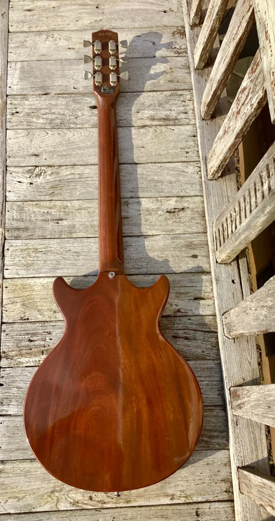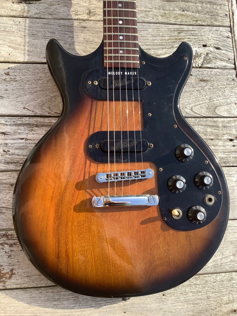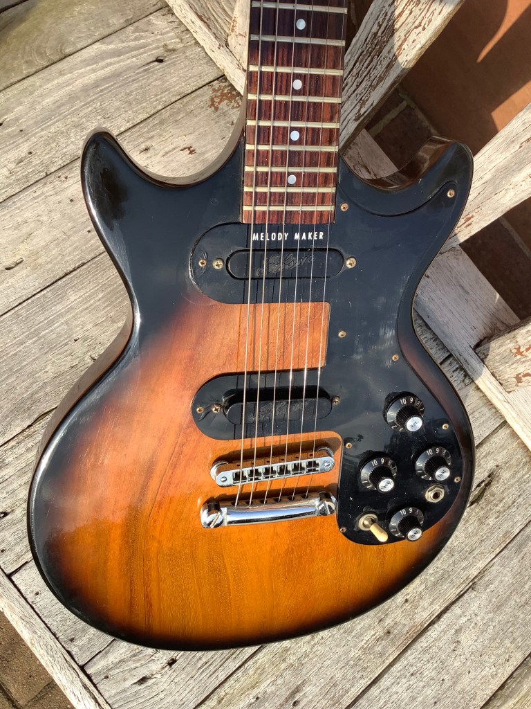 Here a simple Gibson, melody maker 1977, a 1960’s reissue from 1977, serial no 600457. Probs the simplest of vintage Gibson’s, range a Melodymaker. Twin Pickups plastics covers with Moulded Gibson Logo/Name. Separate bridge/tail piece. The guitar is finished in a classic looking is a Brown Sunburst. Rosewood fretboard with dot markers. Small minimal guitar, quite functional. Kinda nice really. Must have been iconic as it shares its name with the famous Melody Maker Music Magazine. Lives in its Gibson Case.