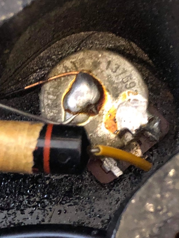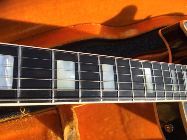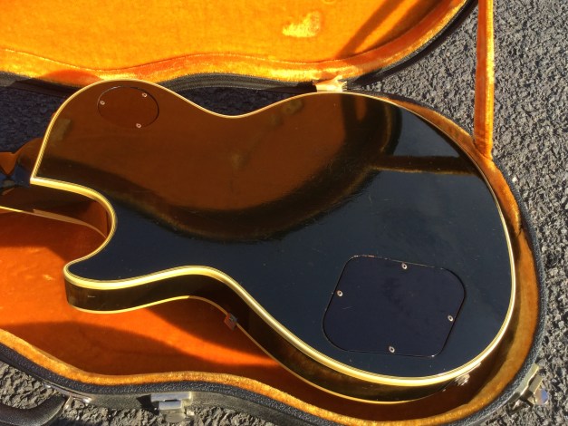 This 1968 Gibson Les Paul Custom Black Beauty is a fine solid body guitar with the jet black body. The last owner had fitted ’72 embossed pick ups covers in tarnished gold. It is one of the top guitars in the collection. Pots date the guitar to 1969, the serial gives it 1968. Admittedly, Gibson’s pots were post dated by anything up to 6months to allow them to be used in previous year models. The pot soldering is original and it looks like no aftermarket mods have been applied. Therefore we have here a gorgeous Gibson Les Paul Custom, a heavy solid body guitar harking back to the LPs of the early 1950s era with a great bit of rock mojo. This guitar is an old school design of beauty with a cool feel and killer look to it, sound wise it is awesome too as it is kitted out with great stock pickups. The fret board is proper quality ebony and plays light and fluid. Guitar is a great player and lives in its original hard-case stamped with the name Ronn McFarlane. We contacted him and he indeed confirmed he’d had the guitar from new and sold it in 1980.
